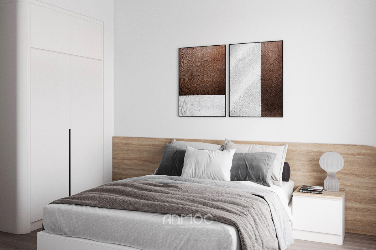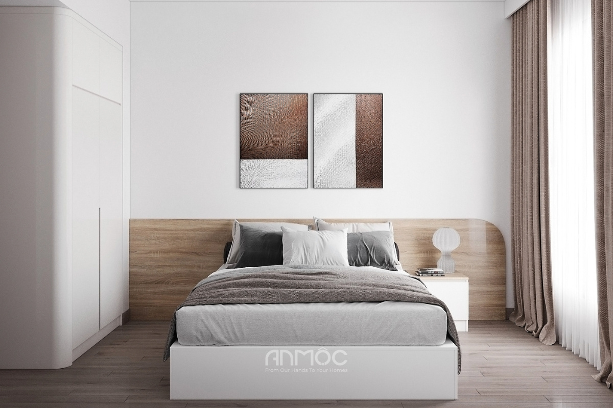 Muốn sở hữu một thiết kế nội thất chung cư 60m2 đẹp, phòng ngủ là một trong những không gian cần được chú trọng trong thiết kế. Phòng ngủ trong căn hộ 60m2 nên được trang trí với gam màu nhẹ nhàng, nội thất tối giản nhưng vẫn đầy đủ tiện ích. Giường ngủ có ngăn kéo, tủ quần áo âm tường là những giải pháp giúp tối ưu diện tích hiệu quả.