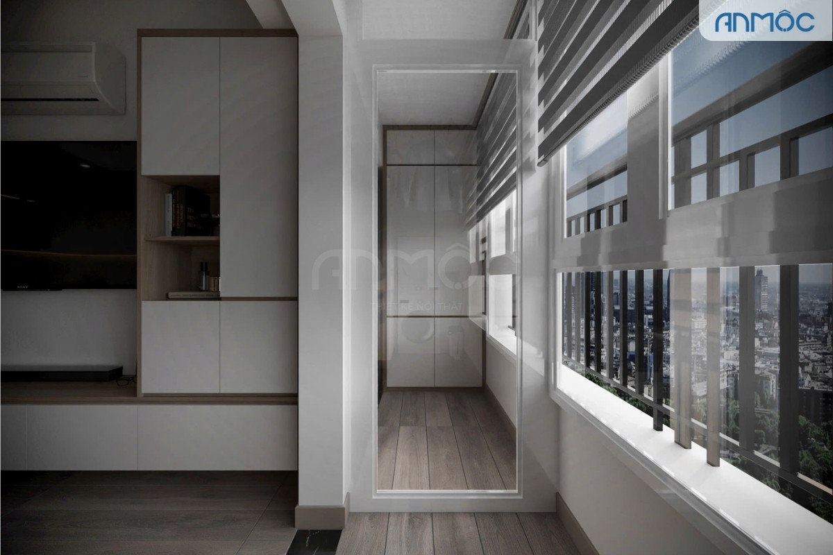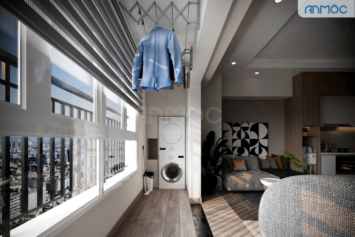 Khu vực ban công căn hộ được thiết kế hiệu quả cho chức năng giặt phơi và thư giãn của gia đình. Hệ tủ đồ thông minh giúp lưu trữ hiệu quả đồng thời giúp bố trí máy giặt và máy sấy hiệu quả.