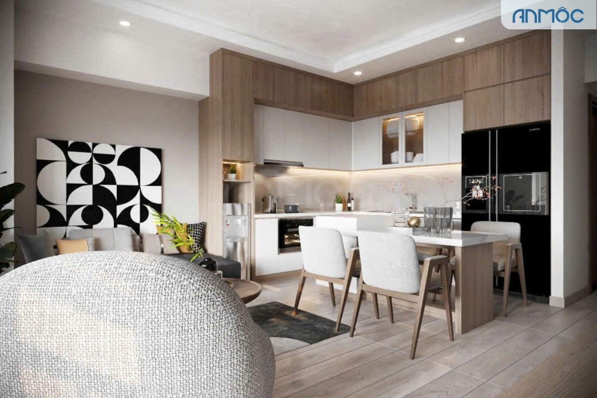 Khu vực bếp được thiết kế theo kiểu bếp mở, liền mạch với phòng khách, tối ưu không gian cho những gia đình yêu thích sự kết nối đồng thời đảm bảo diện tích sử dụng tối đa. Thiết kế bếp hiện đại với cấu trúc chữ L cùng nội thất tối giản nhưng công năng và thẩm mỹ ấn tượng. Tủ bếp được làm từ gỗ cao cấp với màu sắc trung tính. Chiều cao kịch trần với nhiều ngăn lưu trữ tiện lợi như tủ bếp trên, kệ dưới bếp, ngăn kéo, kệ mở… giúp gia chủ sử dụng tiện nghi và hiệu quả.