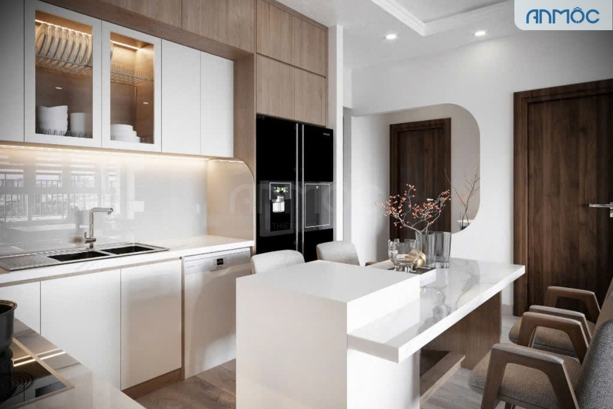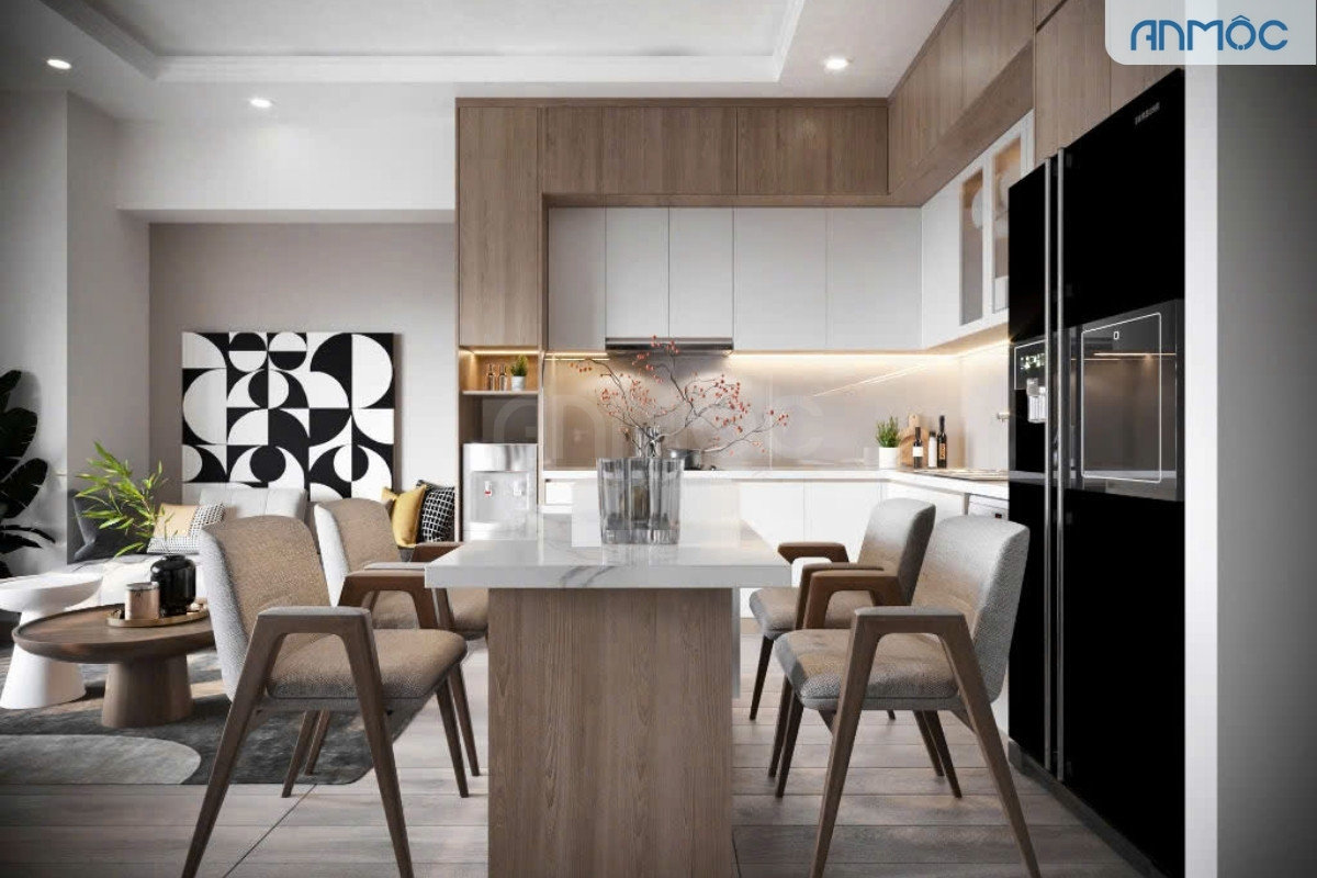 Phòng ăn được bố trí ngay cạnh khu vực bếp, là sự kết hợp hoàn hảo giữa bàn đảo và thiết kế phòng ăn hiện đại. Không chỉ tạo sự kết nối hoàn hảo giữa hai không gian chức năng này mà còn tối ưu diện tích hiệu quả, mang lại trải nghiệm sử dụng tiện nghi cho gia chủ. Chất liệu gỗ kết hợp đá tông màu trắng sáng bóng và mịn màng giúp không gian gọn gàng, thanh lịch và có chiều sâu hơn.