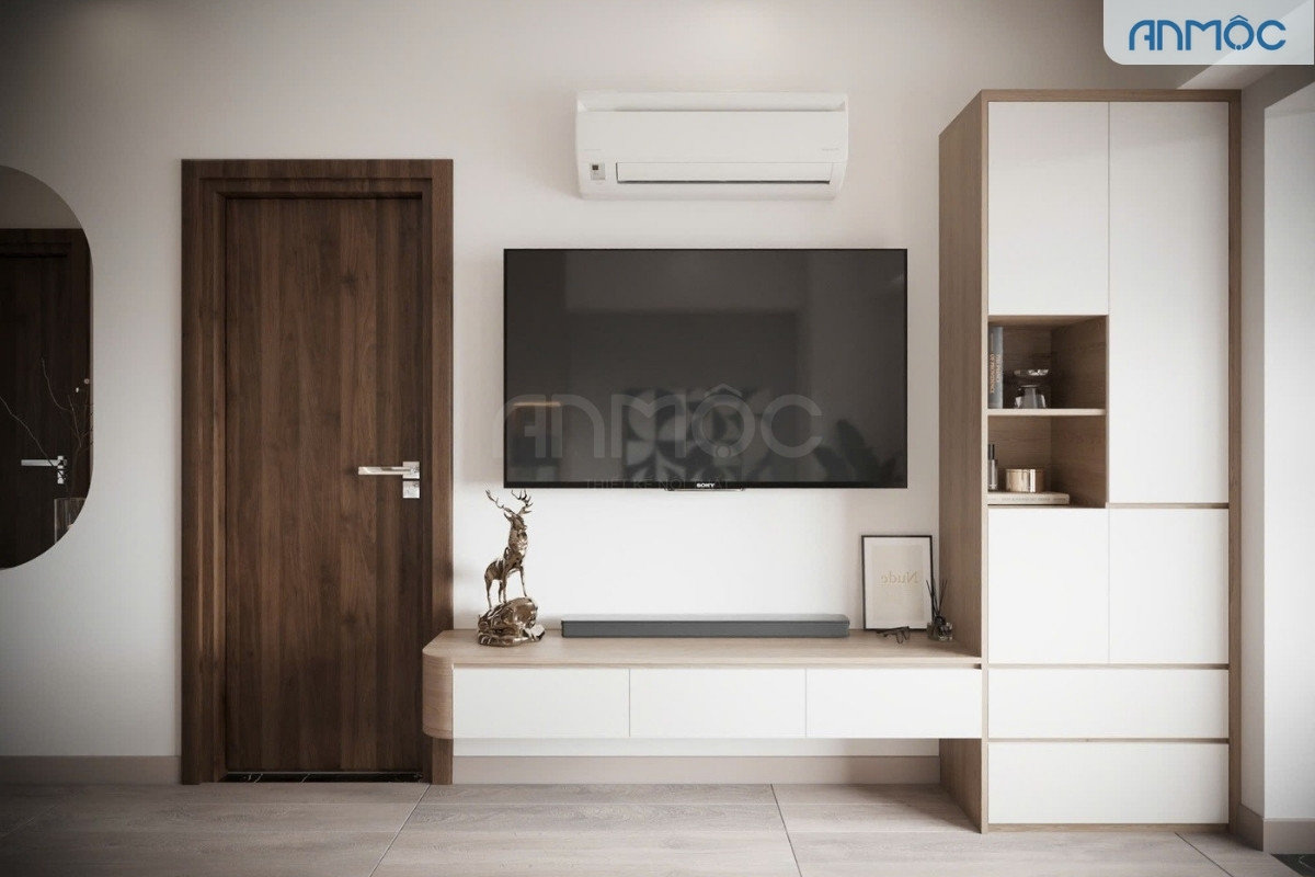 Vách TV được thiết kế theo phong cách tối giản, giúp không gian thêm phần thanh thoát và hiện đại. Hệ tủ được bố trí theo cấu trúc chữ L, tạo nên một không gian lưu trữ thông minh và đẹp mắt. Chất liệu gỗ tự nhiên kết hợp với tông màu trắng chủ đạo giúp làm nổi bật sự sang trọng và tinh tế của tổng thể không gian phòng khách.