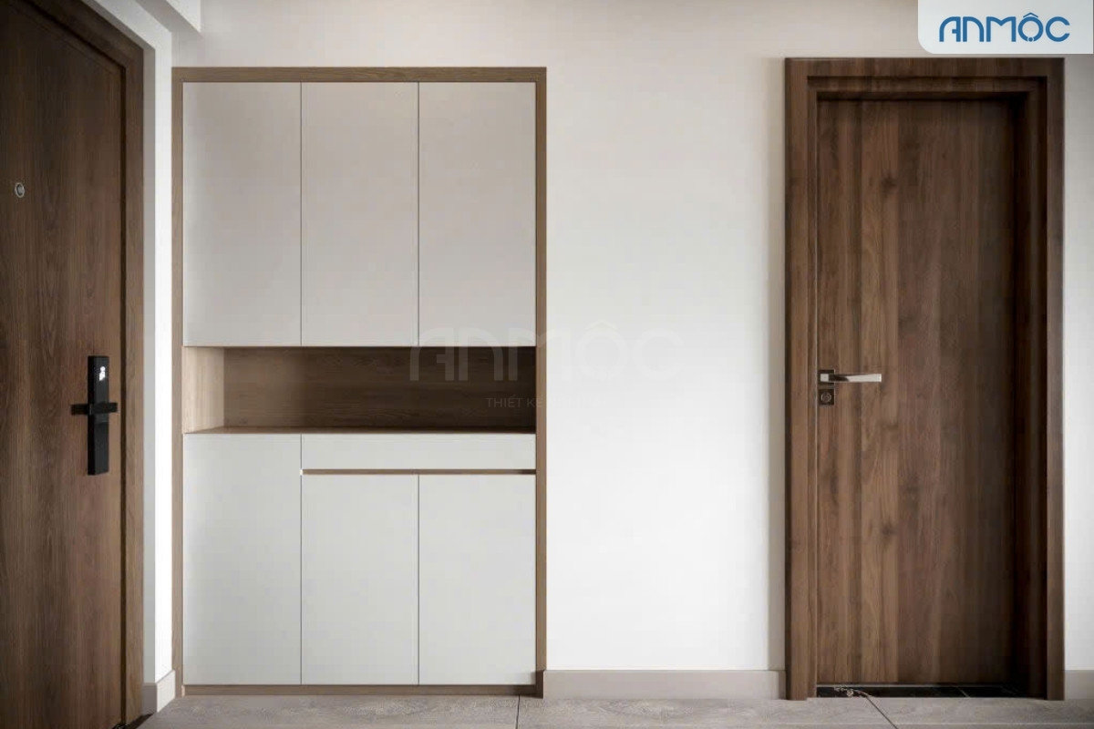 Thiết kế tinh tế và đồng bộ giúp căn hộ trở nên ấn tượng hơn về thị giác, đồng thời tối ưu công năng hiệu quả. Điển hình như tủ giày kết hợp tủ trang trí ngay cửa ra vào căn hộ. Phần diện tích không quá rộng nhưng được bố trí và thiết kế tinh tế với khối tủ phẳng, trơn mịn tông màu gỗ kết hợp màu trắng tiệp với màu sơn trường tạo nên một không gian thoáng rộng và có chiều sâu hơn. Tủ còn phối kệ mở để gia chủ có thêm không gian để trang trí hoặc lưu trữ những đồ dùng cần thiết mỗi khi đi ra ngoài…
