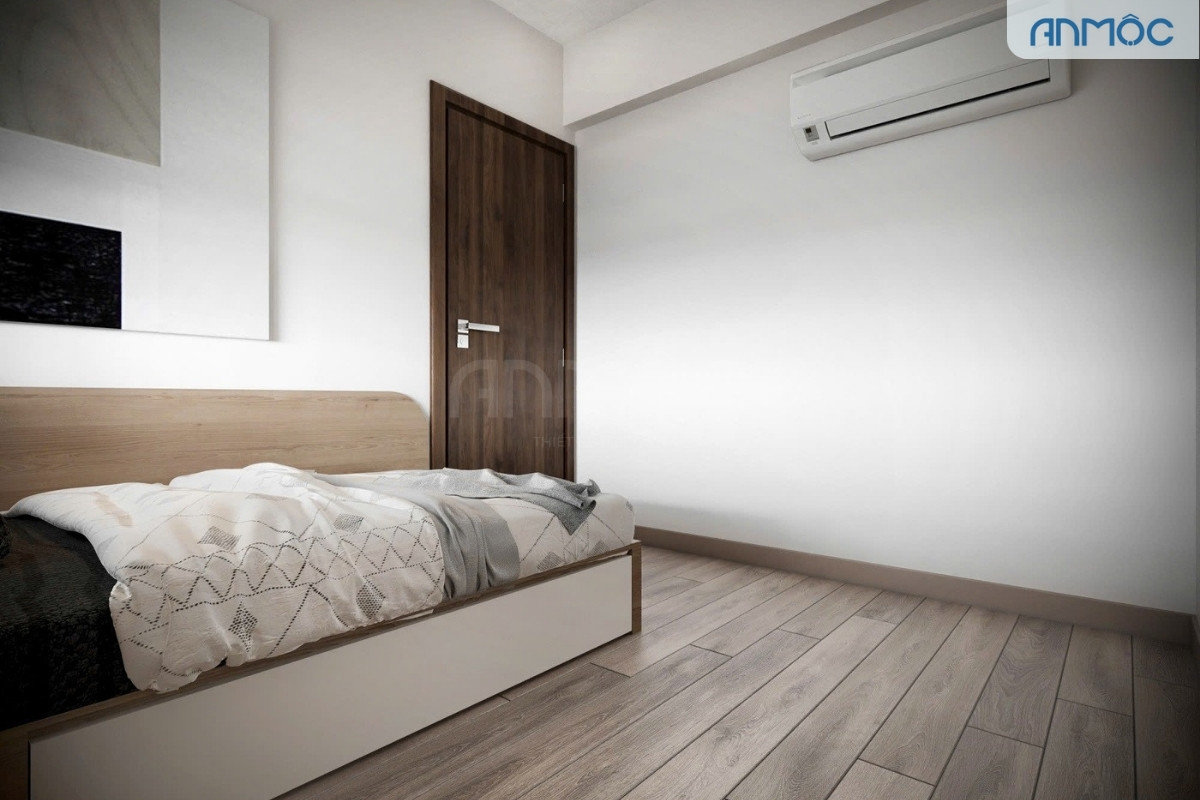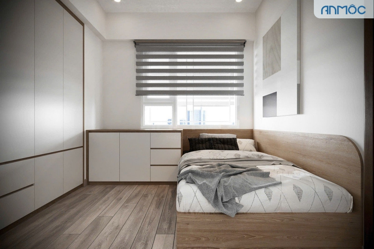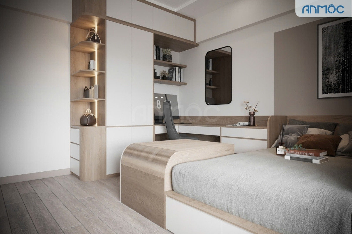 Phòng ngủ tận dụng ánh sáng tự nhiên từ cửa sổ lớn, kết hợp với ánh sáng đèn chiếu sáng nhẹ nhàng từ hệ thống đèn led âm trần, đảm bảo không gian luôn thoáng đãng và thư giãn. Tủ quần áo và kệ lưu trữ thông minh được bố trí hợp lý, giúp tối ưu hóa không gian.