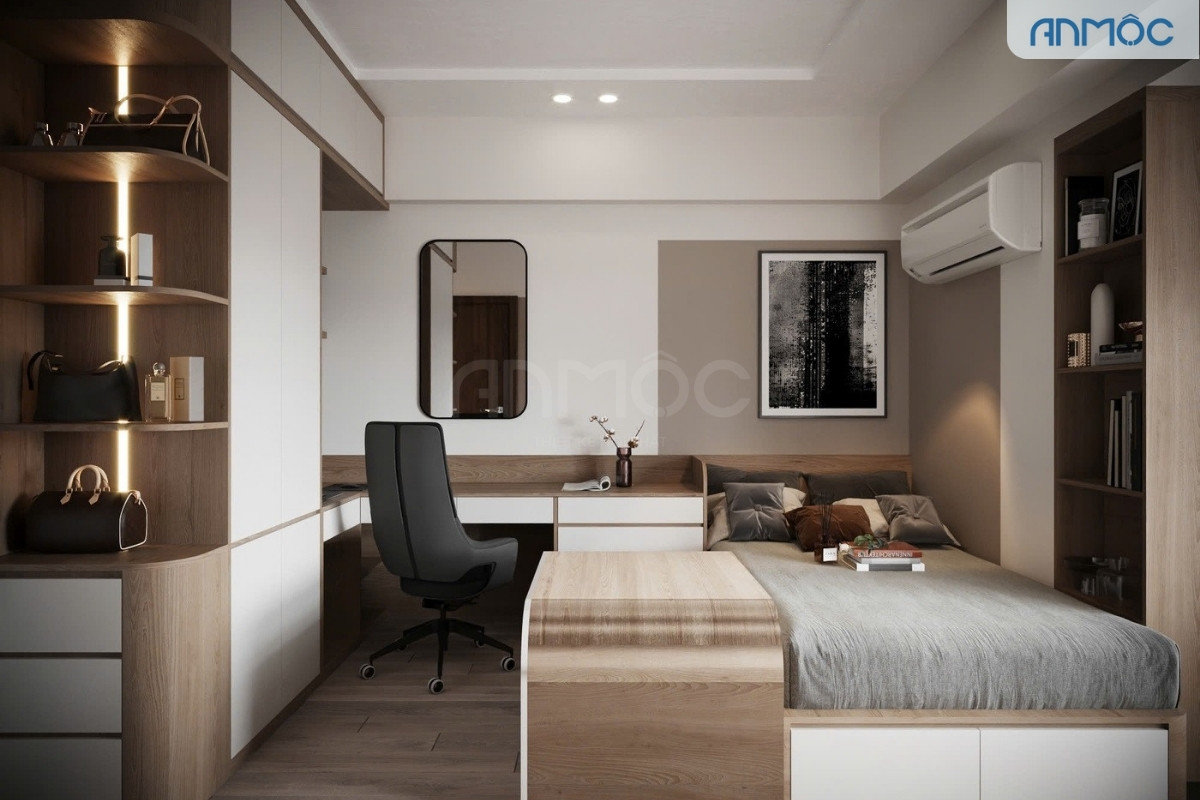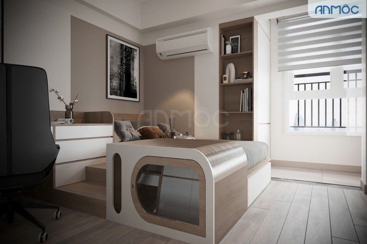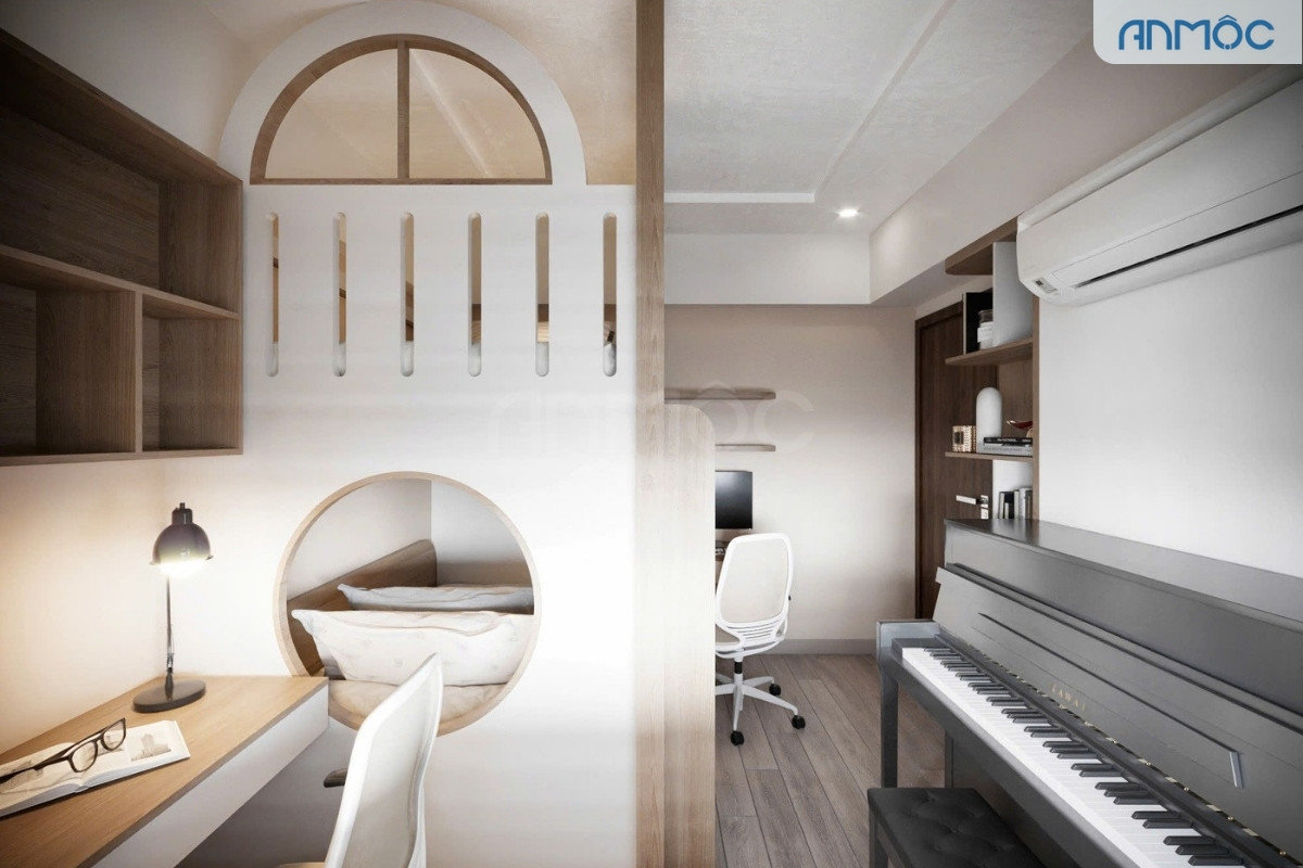 Hệ nội thất thông minh với giường ngủ, bàn làm việc, tủ quần áo… với kiểu dáng đơn giản, nhỏ gọn giúp tăng công năng sử dụng mà vẫn đảm bảo tính thẩm mỹ cho không gian một cách tinh tế. Ánh sáng tự nhiên cũng được đưa vào khéo léo để mang lại sự tươi sáng và thoáng đãng cho căn phòng nhỏ, làm nới rộng trực quan không gian.