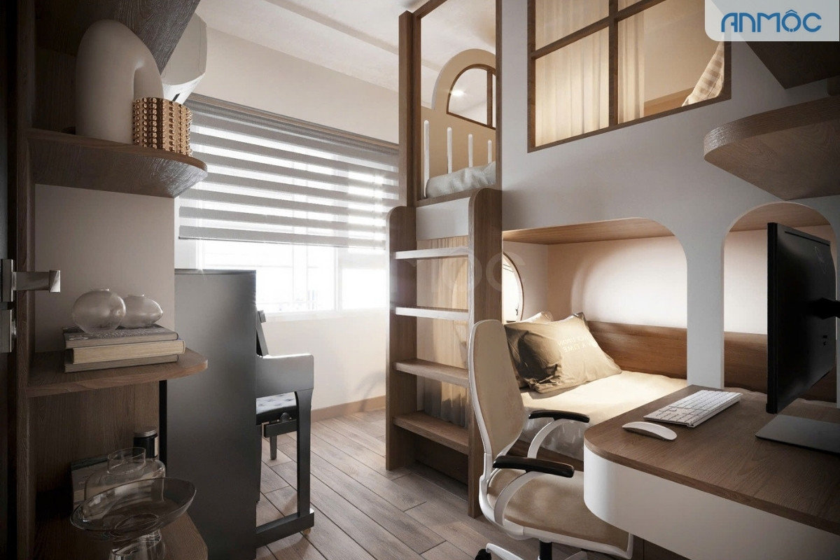 Phòng ngủ dành cho trẻ em trong căn hộ Cantavil An Phú được thiết kế với tinh thần năng động, tươi sáng với bảng màu trung tính nhẹ nhàng, nhằm tạo ra một không gian sống vui tươi và thoải mái cho bé mỗi ngày. Các món nội thất như giường tầng, tủ quần áo và bàn học được bố trí khoa học và hợp lý, giúp tối ưu diện tích sử dụng mà vẫn đảm bảo đầy đủ công năng.