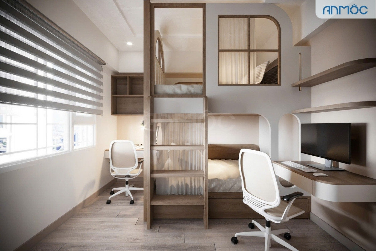 Giường tầng được thiết kế thông minh, không chỉ là nơi nghỉ ngơi mà còn có thể linh hoạt chuyển đổi thành khu vực vui chơi hoặc học tập, phù hợp với nhu cầu phát triển đa dạng của trẻ nhỏ. Tủ quần áo và bàn học được sắp xếp gọn gàng, tạo nên một không gian thoáng đãng, hỗ trợ trẻ trong việc hình thành thói quen ngăn nắp và tự lập.