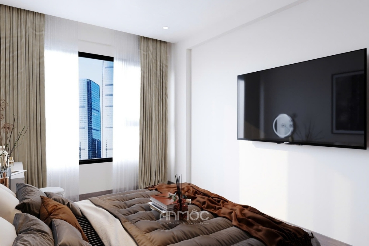 - Trong thiết kế nội thất căn hộ chung cư, An Mộc luôn tính toán kỹ lưỡng để đảm bảo lối thoát hiểm thông thoáng, không bố trí nội thất chắn đầu báo cháy hay cản trở hệ thống vòi phun tự động. Khu vực bếp, hành lang và tủ điện được ưu tiên sử dụng vật liệu chống cháy đạt chuẩn, vừa nâng cao độ an toàn, vừa đáp ứng đầy đủ yêu cầu PCCC của tòa nhà.