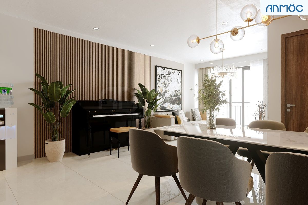 Căn hộ lúc nào cũng tràn ngập ánh sáng tự nhiên. Bên cạnh phòng khách là bức tường được nhấn nhá bởi mảng lam gỗ ấm áp, kết hợp thêm cây đàn Piano lịch thiệp.