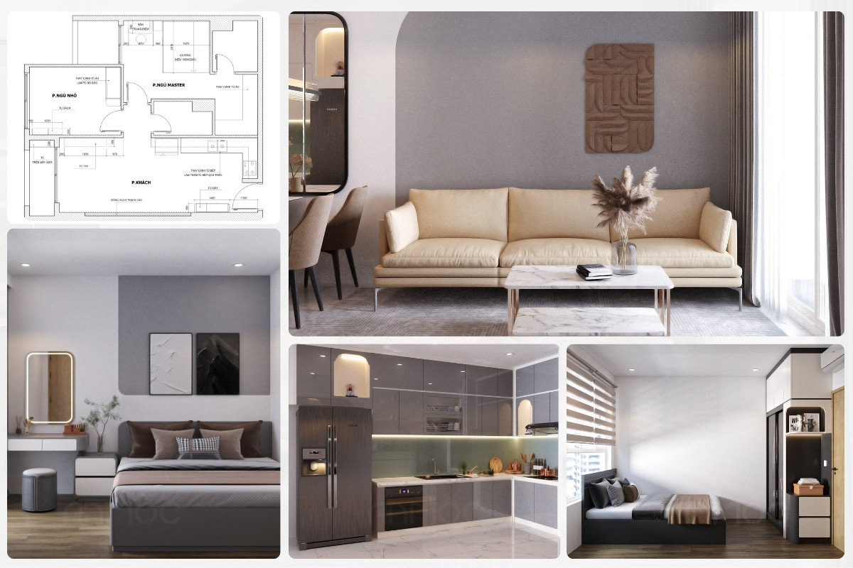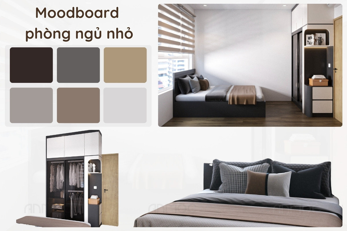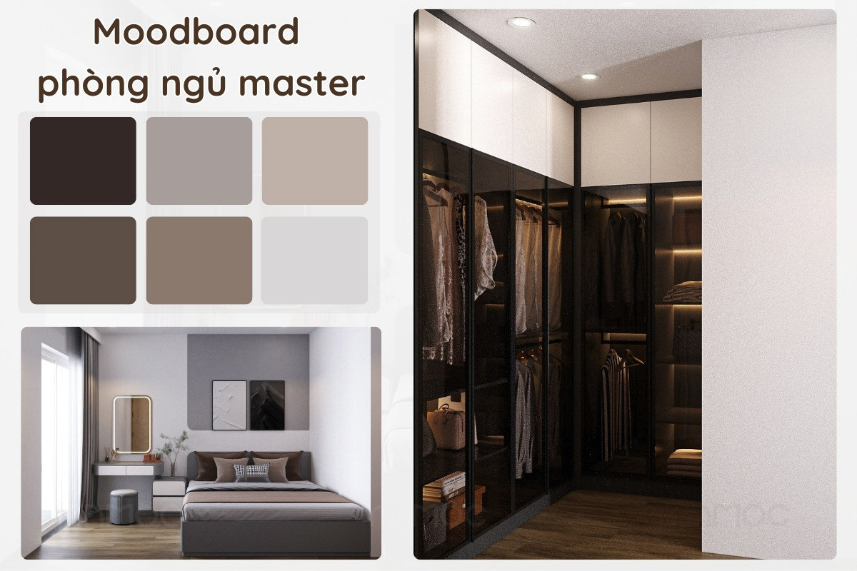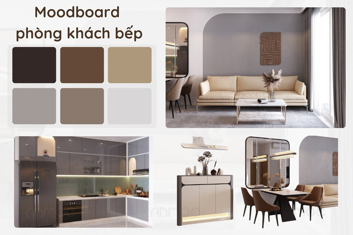 Moodboard màu sắc được xây dựng dựa trên các gam trung tính chủ đạo như be, xám và nâu gỗ, kết hợp bề mặt hoàn thiện hiện đại nhằm tạo cảm giác ấm áp, thư giãn nhưng vẫn giữ được nét sang trọng, thanh lịch cho tổng thể không gian sống.