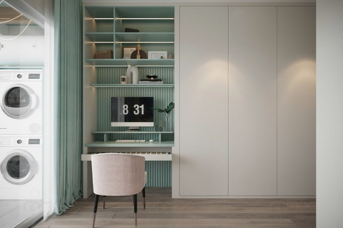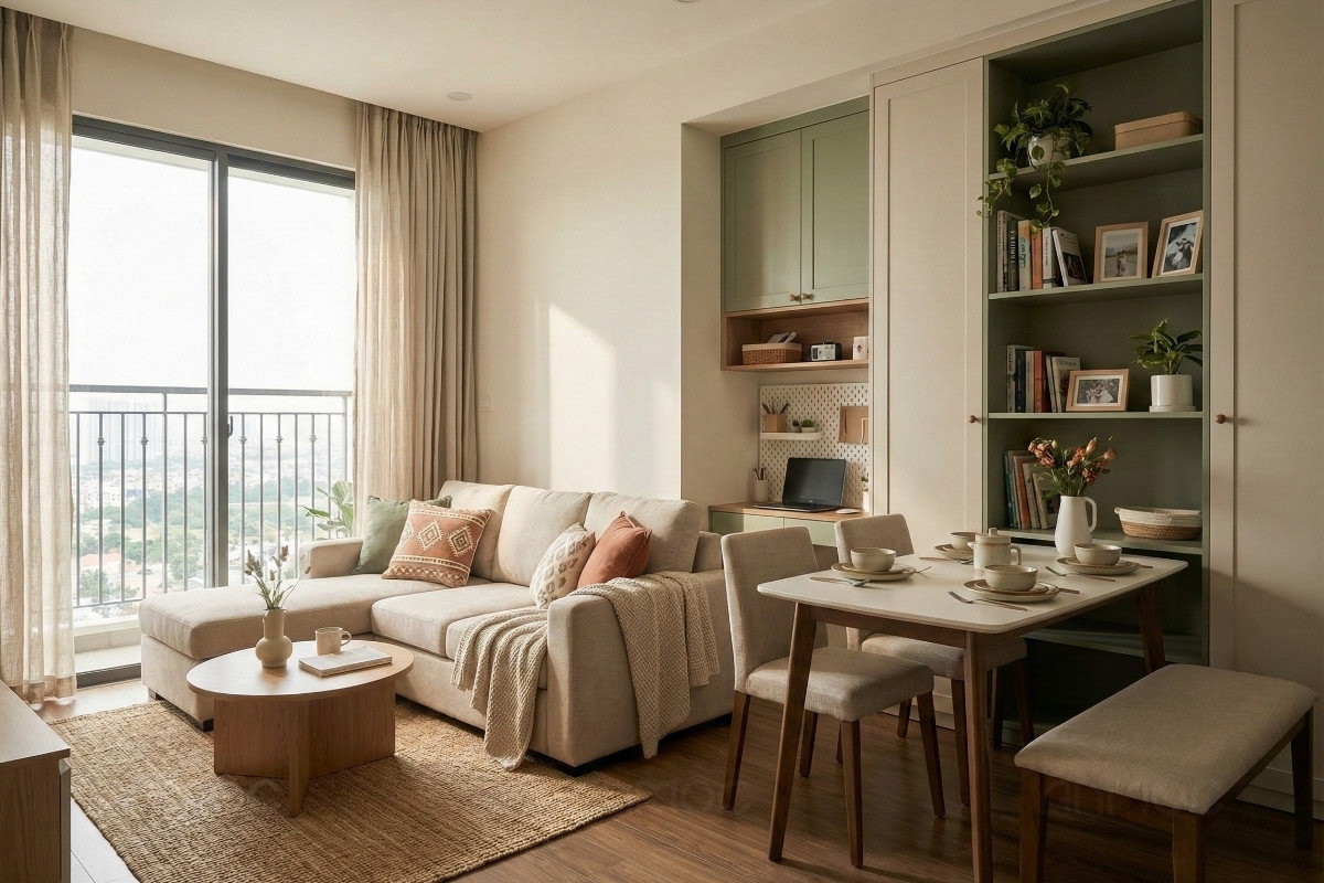 Đồng thời, nên lựa chọn nội thất đồng bộ, kích thước vừa phải, kết hợp hệ tủ lưu trữ theo chiều cao để tối ưu công năng và giữ không gian luôn gọn gàng.