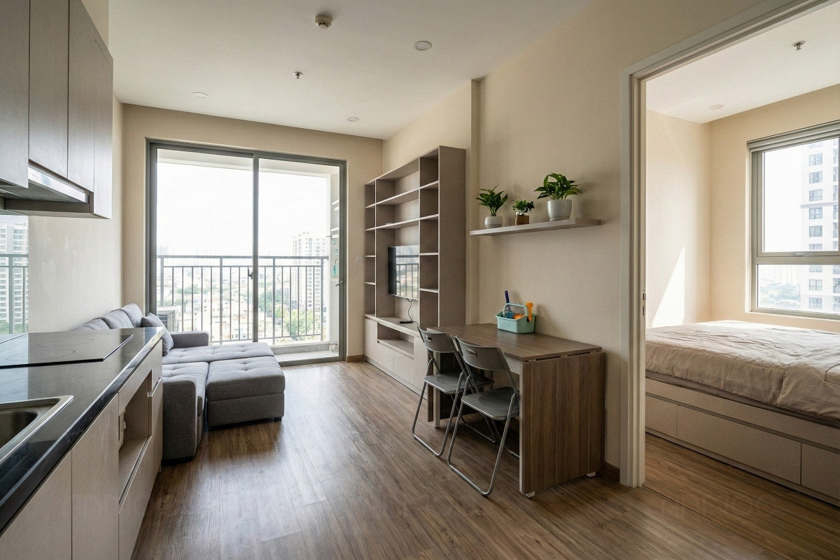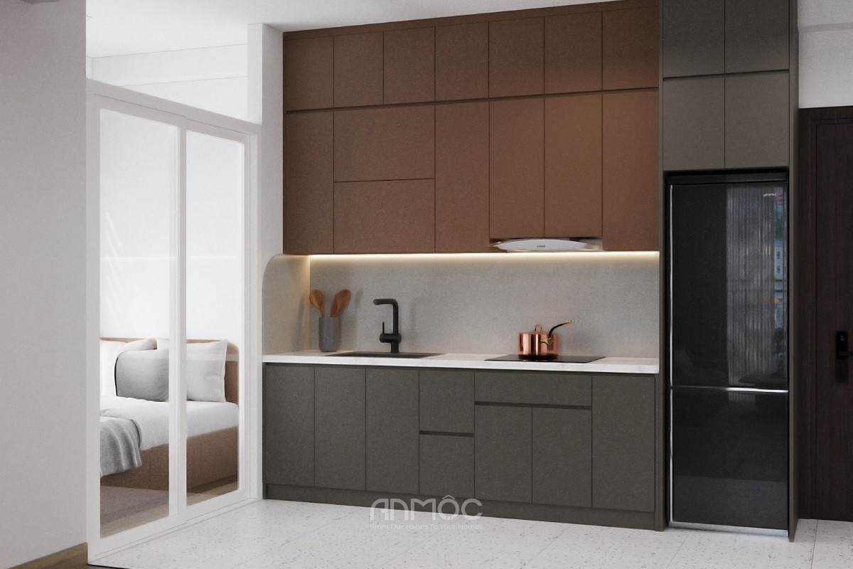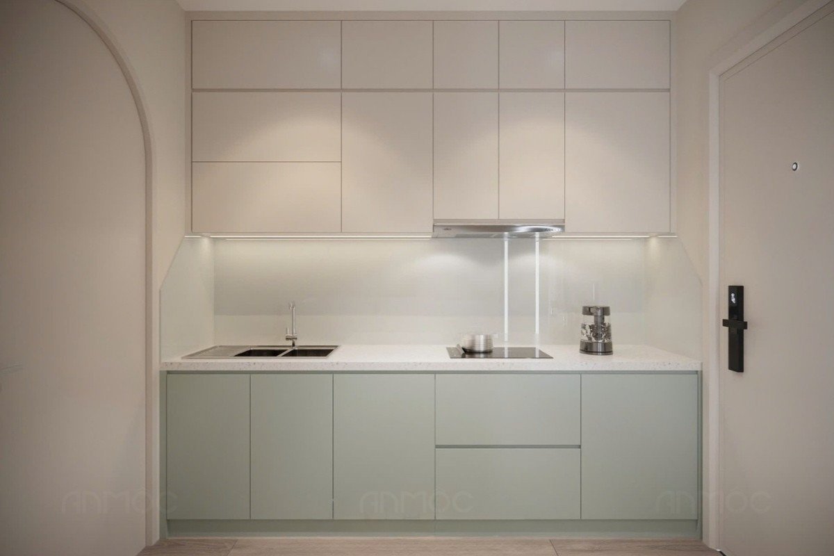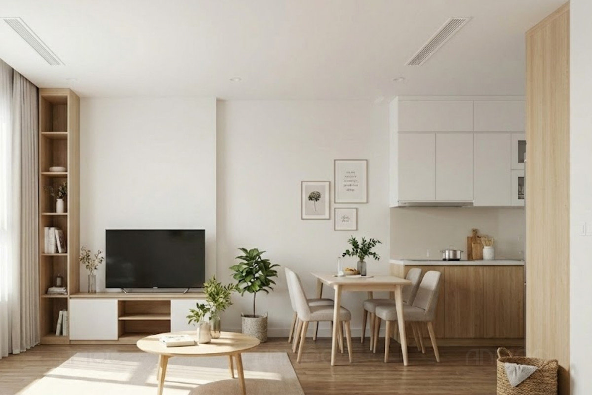 Với các căn hộ studio diện tích 30m2-50m2, mục tiêu quan trọng nhất là tối ưu không gian sử dụng và tạo cảm giác rộng rãi, thoáng đãng. Phòng khách và bếp nên thiết kế theo không gian mở để tăng sự thông thoáng, kết hợp nội thất gọn gàng, tủ âm tường và giải pháp lưu trữ thông minh nhằm tiết kiệm diện tích.