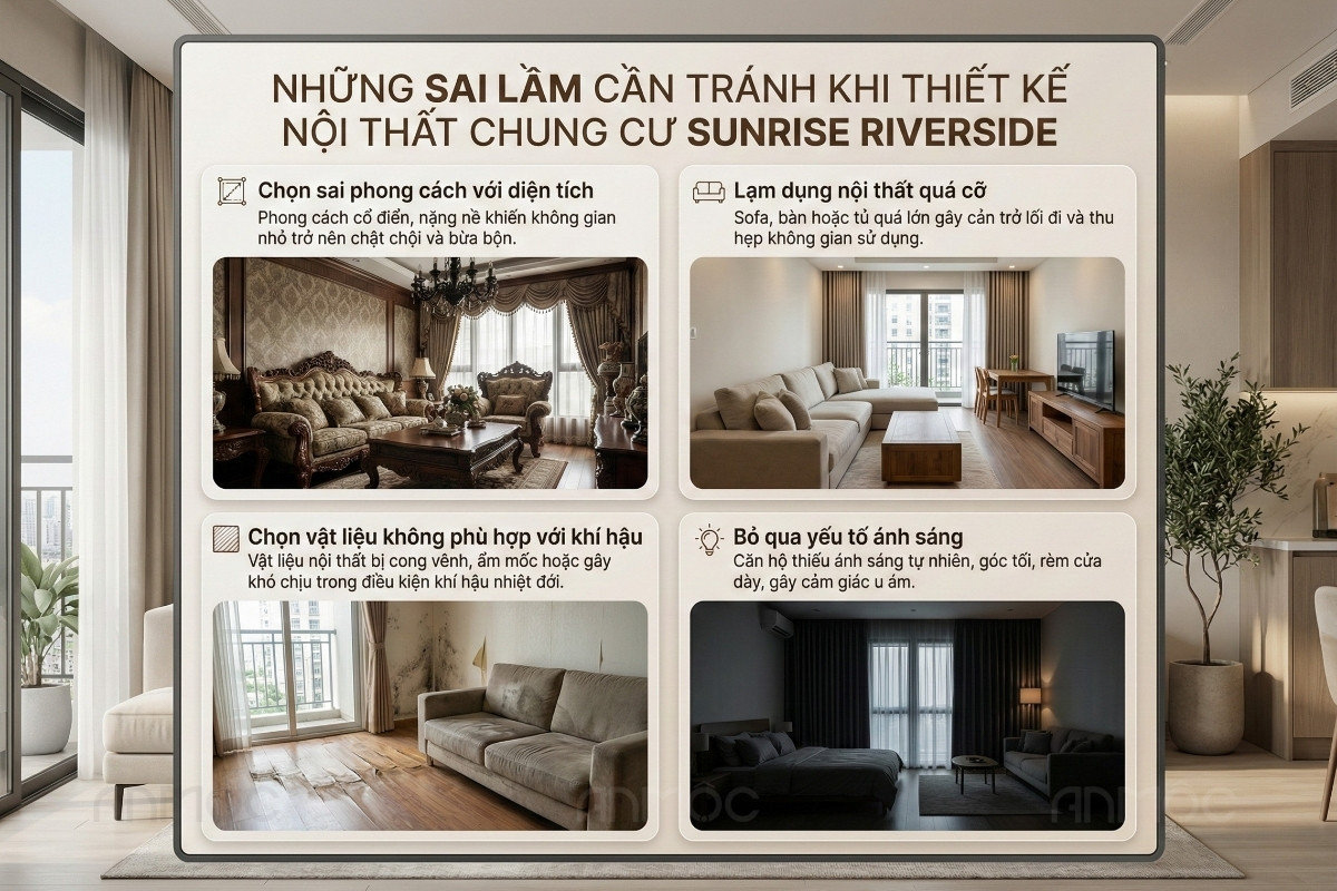 Khi thiết kế nội thất chung cư Sunrise Riverside, nhiều gia chủ thường mắc phải các sai lầm không chỉ gây bất tiện khi sử dụng mà còn ảnh hưởng lâu dài đến chất lượng sống. Nội dung dưới đây sẽ giúp bạn nhận diện và phòng tránh những lỗi thường gặp.