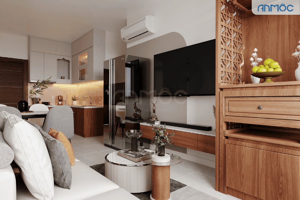 Phòng khách được thiết kế mở, liên thông với khu vực bếp và phòng ăn giúp tối ưu diện tích đồng thời tạo cảm giác thông thoáng, rộng rãi. Thêm vào đó, không gian rộng rãi hơn nhờ nhận được lượng ánh sáng tự nhiên lớn thông qua hệ cửa ban công. Nội thất được thiết kế hiện đại kết hợp với các chi tiết trang trí truyền thống mang lại cảm giác ấm áp và gần gũi.