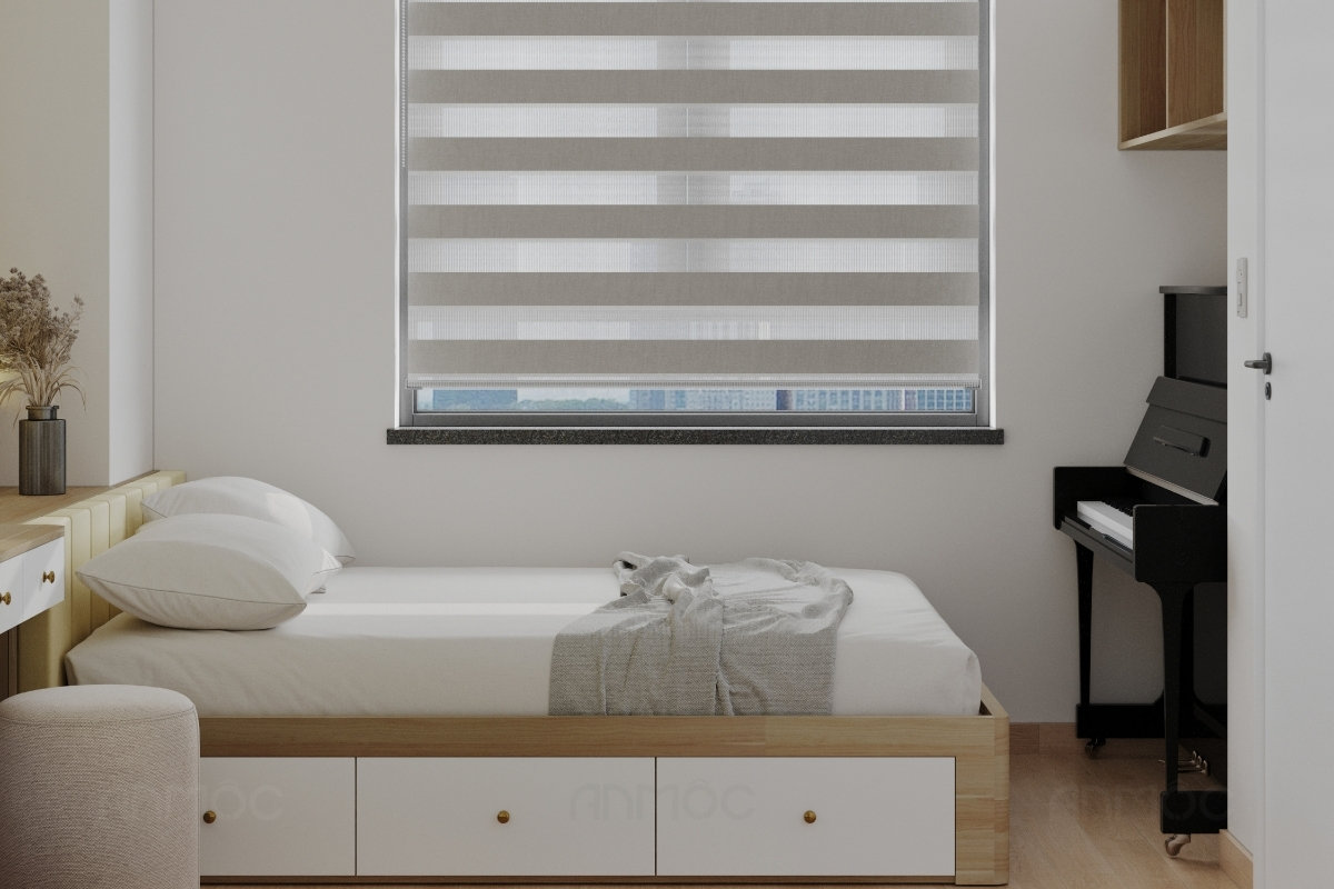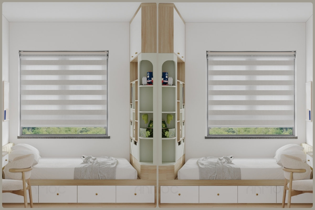 Phòng ngủ nhỏ trong dự án này cũng được bố trí gọn gàng nhưng vẫn đảm bảo đầy đủ công năng. Giường ngủ, bàn làm việc và hệ tủ được thiết kế liền khối, tận dụng tối đa diện tích mà vẫn giữ sự thông thoáng. Hệ tủ kịch trần kết hợp kệ mở giúp tăng lưu trữ và tạo điểm nhấn nhẹ nhàng.