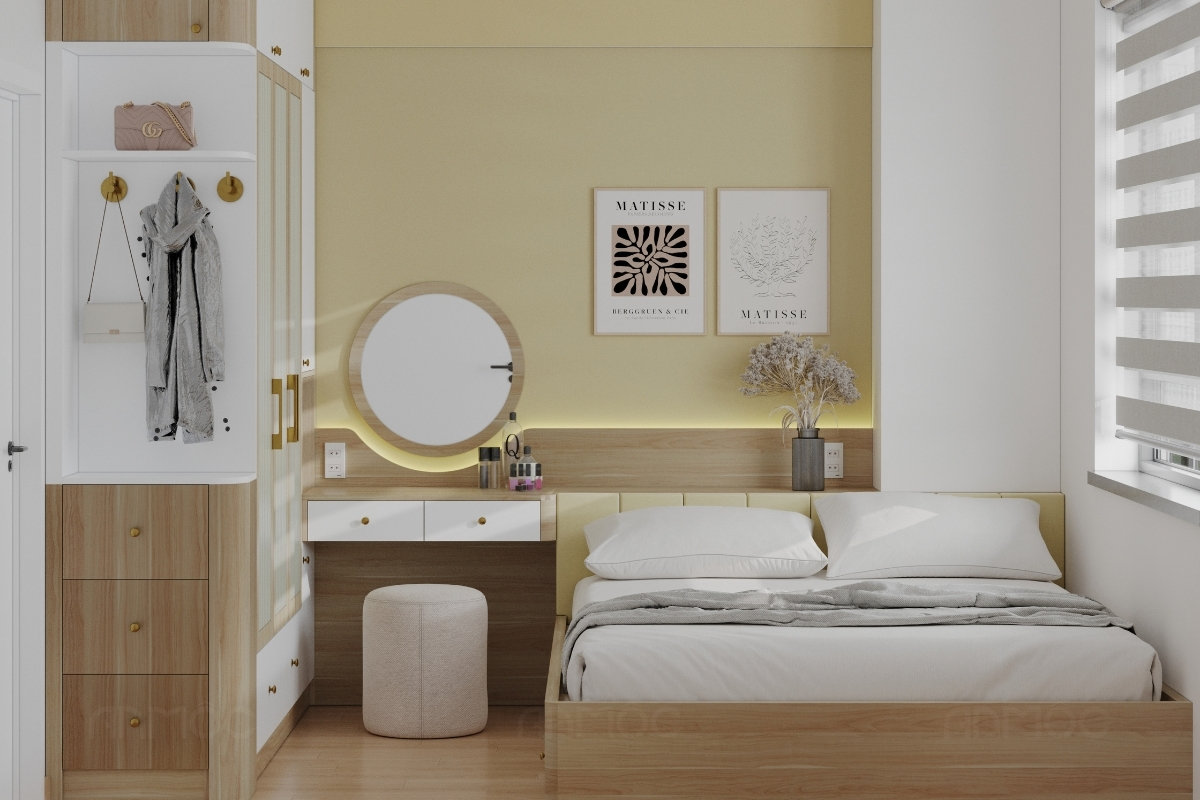 Trong dự án thiết kế nội thất chung cư Topaz Home 67m2, phòng ngủ master được định hướng theo cảm giác thư giãn và dễ chịu, phù hợp nhu cầu gia chủ. Theo đó, giường hộp tích hợp lưu trữ kết hợp bàn trang điểm nhỏ gọn giúp tối ưu diện tích mà vẫn đảm bảo tiện nghi.