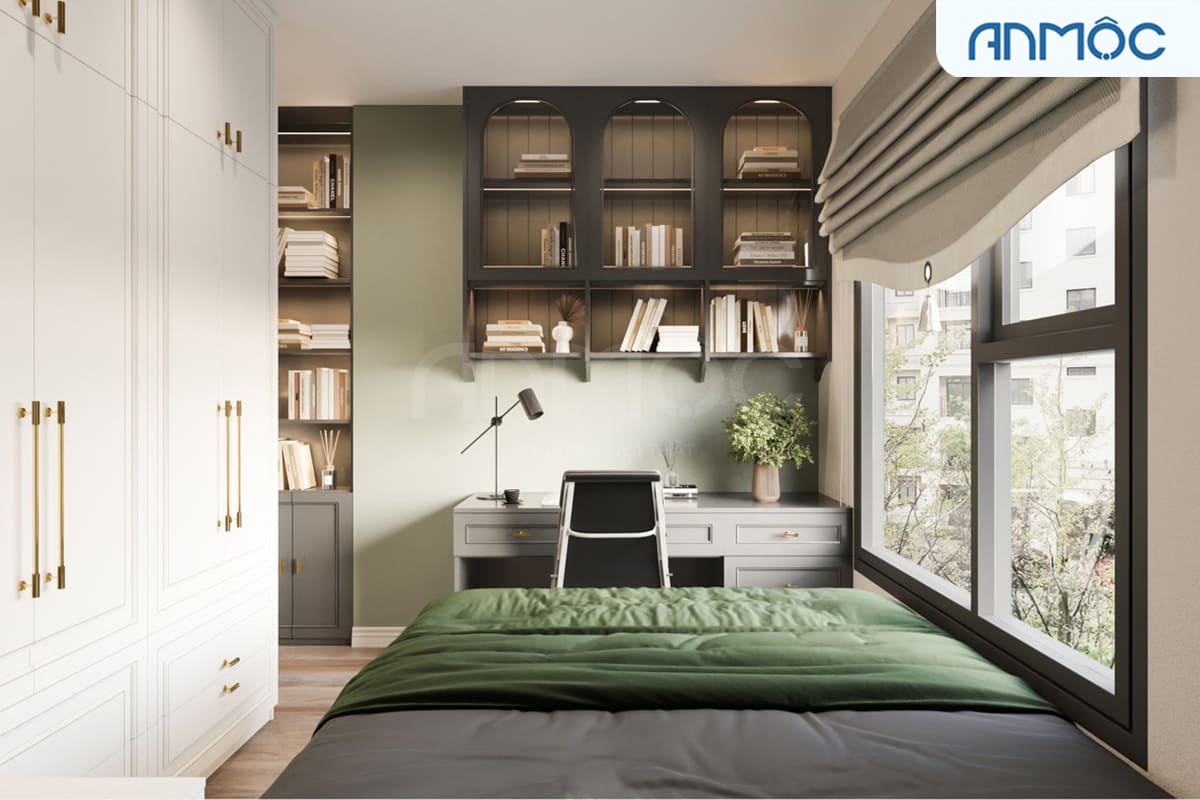 Khác với phòng ngủ master sử dụng tông xanh dương pastel làm điểm nhấn thì phòng ngủ nhỏ lại thiên về tông màu xanh lá cây nhẹ nhàng, tươi trẻ, phù hợp với lứa tuổi của chủ nhân căn phòng.