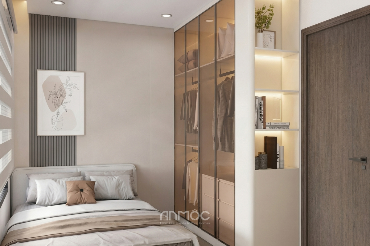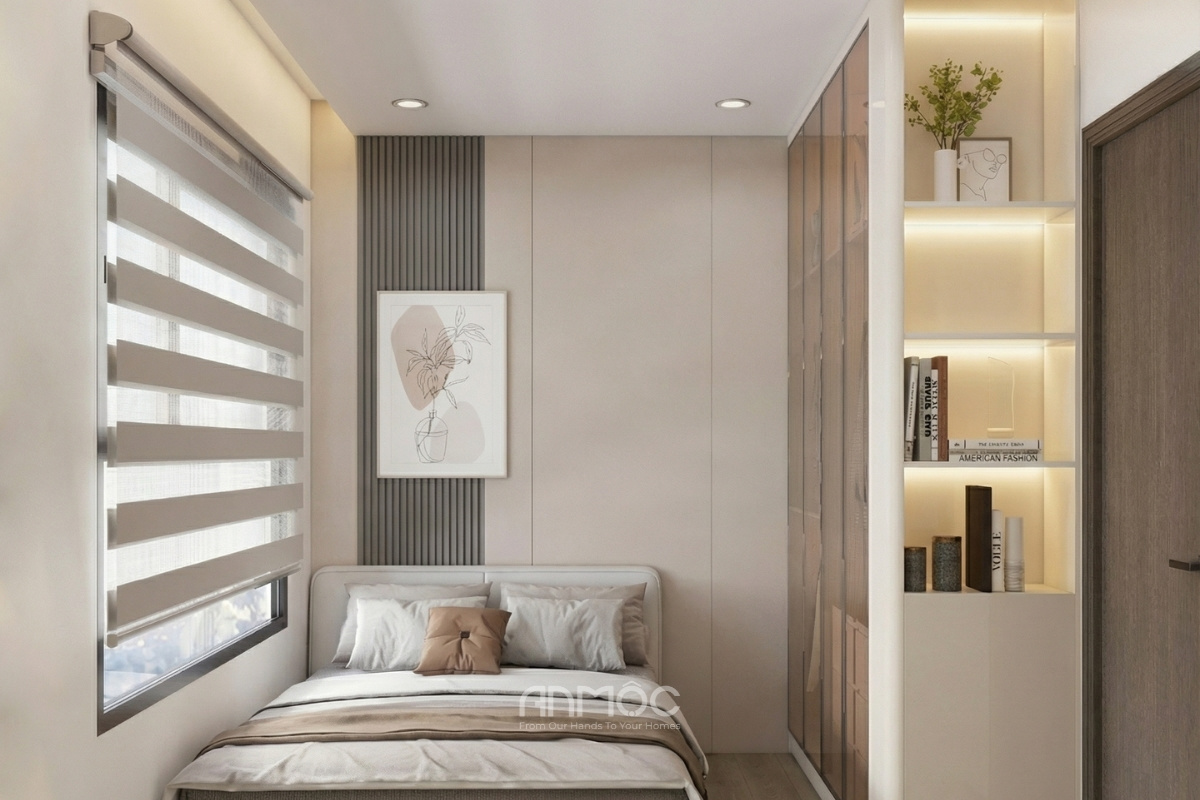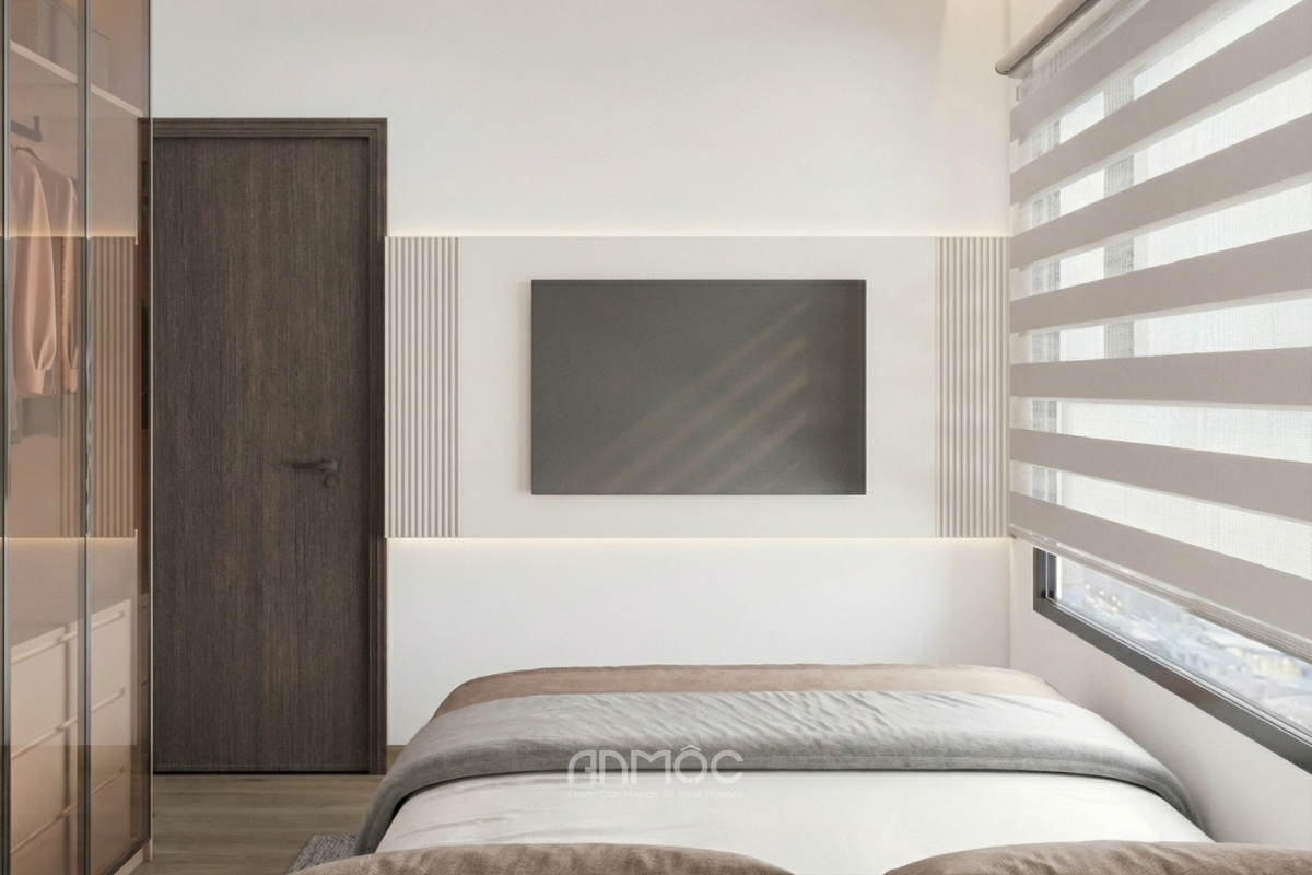 Phòng ngủ nhỏ được thiết kế đồng bộ với phòng ngủ master, giữ nguyên tinh thần hiện đại, tối giản và thanh lịch. Vật liệu, bảng màu cũng được lựa chọn tương tự để tạo sự thống nhất trong tổng thể căn hộ. Tuy không có bàn trang điểm như phòng chính, nhưng không gian vẫn đảm bảo đầy đủ tiện nghi với giường ngủ, tủ áo và hệ rèm cầu vồng, mang lại cảm giác riêng tư và ấm cúng. Cách bài trí gọn gàng, tiết chế chi tiết giúp phòng ngủ nhỏ không bị chật chội mà vẫn đủ thoải mái cho nhu cầu nghỉ ngơi, thư giãn hàng ngày.