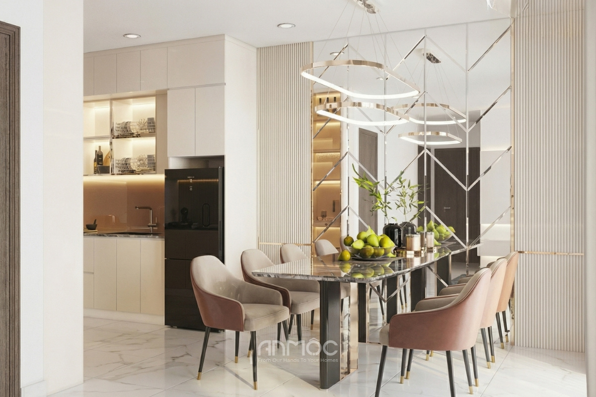 Không gian ăn uống được đặt ngay trung tâm căn hộ, trở thành trục kết nối hài hòa giữa các khu vực chức năng như bếp, phòng khách và sảnh. Thiết kế tinh gọn, khoa học tạo nên sự liền mạch trong sinh hoạt hàng ngày, đồng thời giữ được vẻ đẹp hiện đại và sang trọng. Bảng màu trắng thanh lịch phối hợp cùng các tông màu trung tính làm điểm nhấn, kết hợp tận dụng tối đa ánh sáng tự nhiên, giúp căn hộ nhỏ trở nên sáng bừng và rộng rãi hơn.