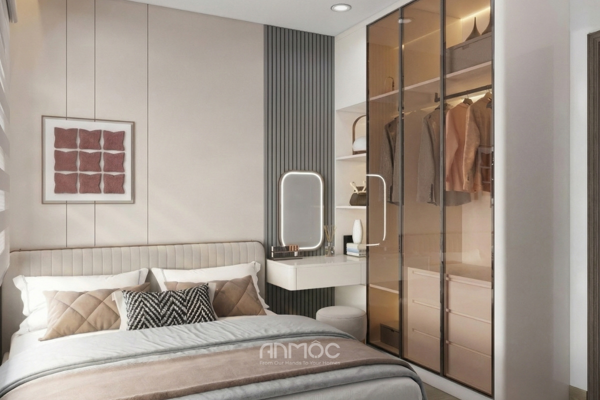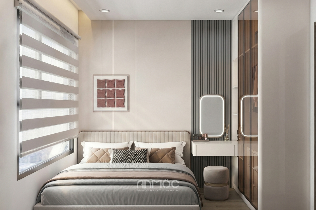 Giường ngủ bọc nệm cao cấp, phần đầu giường bọc nệm êm ái, tạo điểm tựa vững chắc cả về cảm giác lẫn thị giác. Vách đầu giường ốp gỗ hiện đại chia ô dọc giúp căn phòng thêm điểm nhấn mà vẫn giữ được sự tối giản. Bên cạnh giường là bàn trang điểm treo gọn nhẹ, đi cùng gương đèn led cảm ứng, ghế nhung tròn nhỏ nhắn – tất cả hòa quyện tạo nên một không gian đẹp đẽ và tiện dụng cho sinh hoạt cá nhân.
