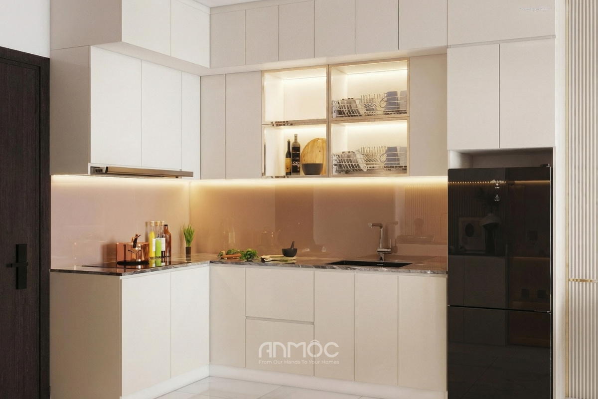 Cấu trúc bếp chữ L tận dụng tối đa góc chết trong căn hộ để trở thành một không gian nấu ăn vô cùng tiện nghi và thanh lịch. Tủ bếp thiết kế đơn giản với chiều cao kịch trần. Cánh từ trơn phẳng phủ laminate trắng sứ thanh thoát với tay nắm âm tạo cảm giác liền mạch và sang trọng. Mặt bếp sử dụng đá đen cao cấp, backsplash là kính cường lực màu nude ánh đồng – vừa dễ vệ sinh, vừa tăng hiệu ứng phản chiếu ánh sáng.