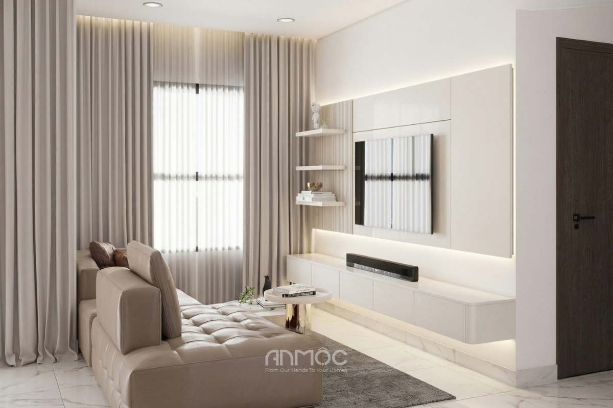 Vách TV được xử lý đơn giản mà hiện đại, với các khối hộp hình học thanh lịch, đèn led hắt nhẹ tạo chiều sâu cho không gian phối cùng kệ mở trang trí tinh tế. Bên dưới là kệ TV treo tông màu trắng thanh thoát giúp tối ưu không gian hiệu quả. Ánh sáng tự nhiên từ hai ô cửa sổ lớn được điều tiết bởi rèm hai lớp, cho phép căn phòng đón nắng dịu ban ngày và giữ sự riêng tư vào buổi tối.
