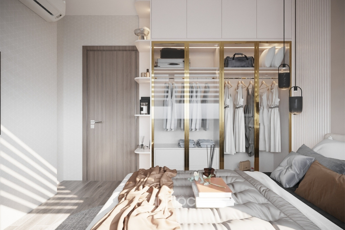 Là không gian nghỉ ngơi quan trọng nhất trong nhà, phòng ngủ chính được thiết kế để phản ánh trọn vẹn gu thẩm mỹ và cá tính của chủ nhân. Hệ tủ quần áo có chiều cao kịch trần giúp mở rộng không gian lưu trữ. Thiết kế cánh kính khung viền vàng tạo điểm nhấn sang trọng, đồng thời mang lại hiệu ứng chiều sâu, giúp căn phòng trở nên thoáng đãng và đẳng cấp hơn. Bên trong, hệ đèn hắt âm tinh tế cùng cách chia ngăn tủ hợp lý không chỉ làm đẹp mà còn tối ưu công năng sử dụng.