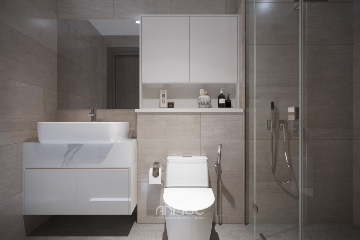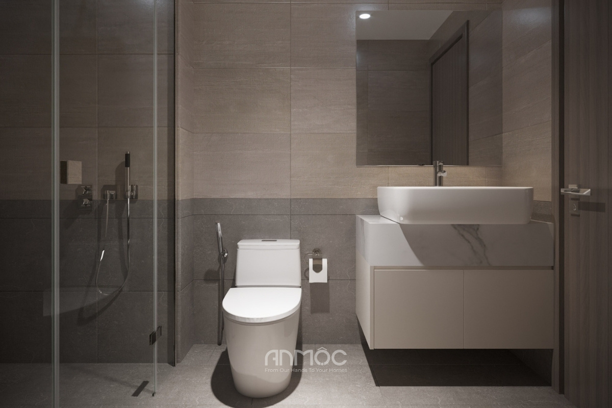 Thiết kế phòng tắm theo tinh thần tối giản, đề cao công năng nhưng vẫn giữ được sự tinh tế và sự thoải mái trong trải nghiệm. Tone màu ghi xám trung tính kết hợp cùng chất liệu gạch vân đá mang lại cảm giác sạch sẽ, hiện đại và dễ bảo trì.