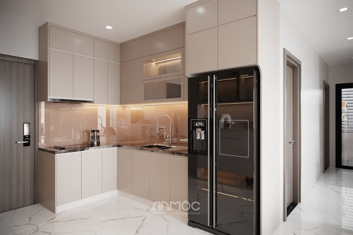 Khu vực bếp được bố trí theo dạng chữ L nhỏ gọn, ôm sát góc tường nhằm tối ưu không gian sử dụng mà vẫn đảm bảo công năng nấu nướng. Hệ tủ bếp cao kịch trần với gam màu be trung tính mang đến cảm giác nhẹ nhàng, tinh tế, đồng thời gia tăng diện tích lưu trữ.