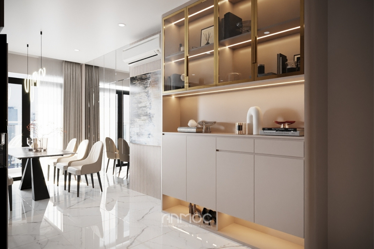 Các khu vực chức năng, từ bếp nấu, chậu rửa đến hệ tủ lưu trữ được sắp xếp khoa học theo nguyên lý tam giác, giúp người dùng di chuyển linh hoạt và tiết kiệm thời gian trong quá trình nấu nướng. Đối diện bếp là hệ tủ đa năng kết hợp giữa tủ giày và kệ trang trí. Thiết kế này không chỉ đáp ứng nhu cầu lưu trữ giày dép một cách gọn gàng mà còn tạo điểm nhấn thẩm mỹ cho lối vào, đồng thời giúp cân bằng không gian giữa khu vực chức năng và khu vực sinh hoạt chung.