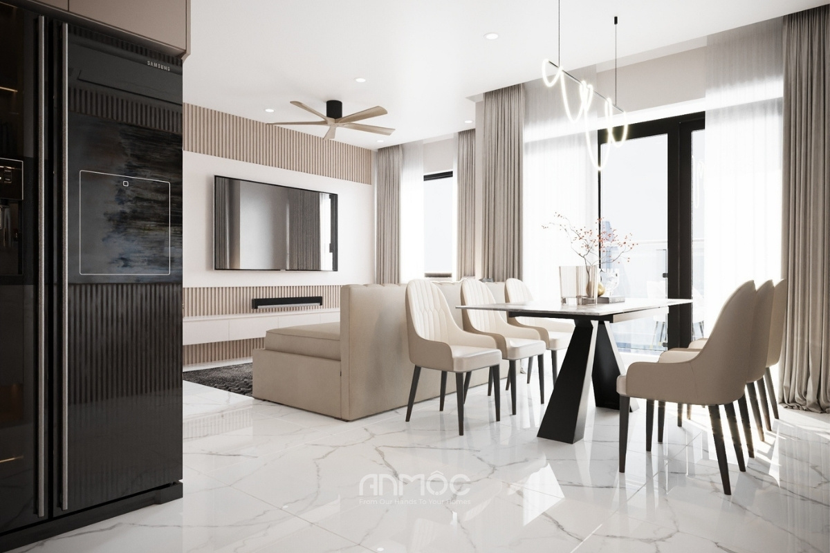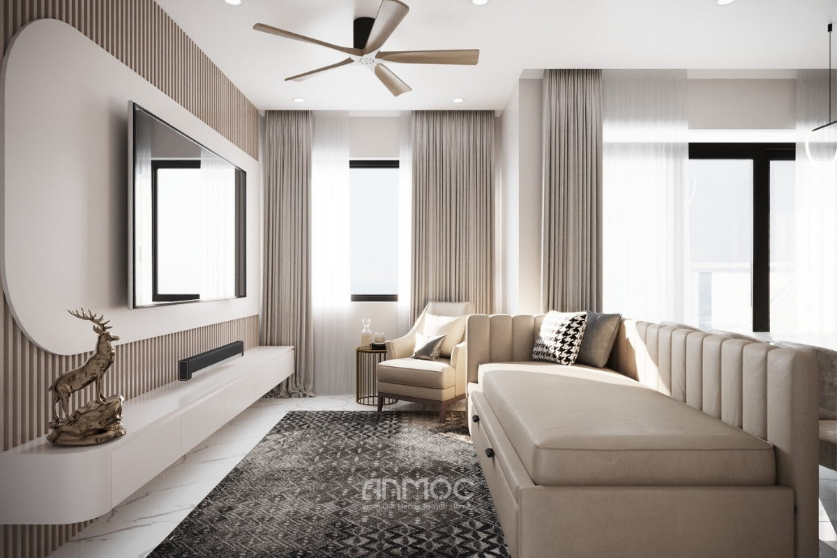 Mảng tường tivi được xử lý tinh tế với hệ lam sóng chạy dọc và điểm nhấn là đường cong lớn bo viền – vừa tạo hiệu ứng thị giác mềm mại, vừa giúp trung hòa các yếu tố hình khối, mang lại cảm giác gần gũi và thân thiện cho không gian tiếp khách. Các rèm cửa được thiết kế hai lớp với tông màu đồng bộ, mang lại cảm giác nhẹ nhàng ấm áp đồng thời giúp điều chỉnh ánh sáng hiệu quả hơn.