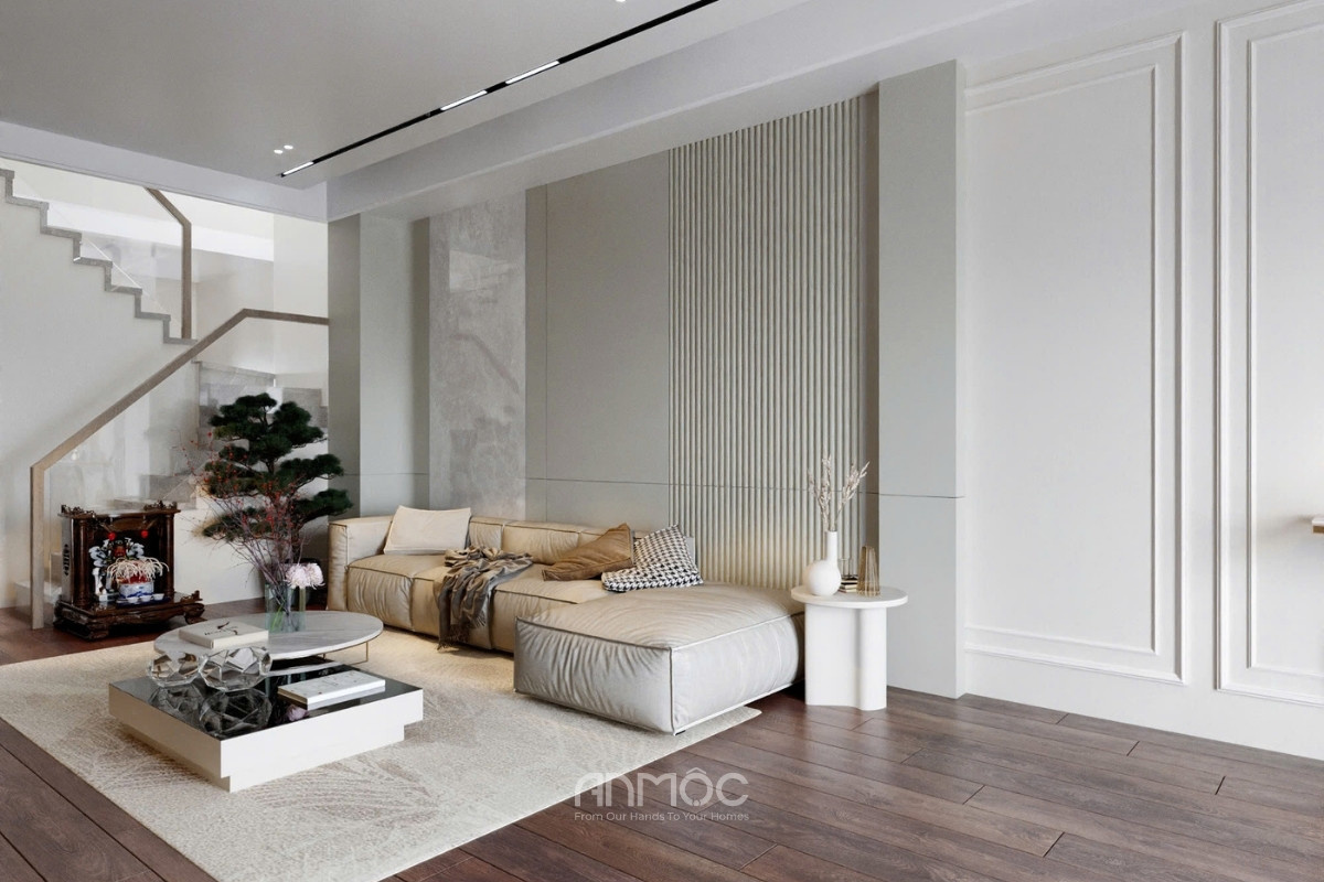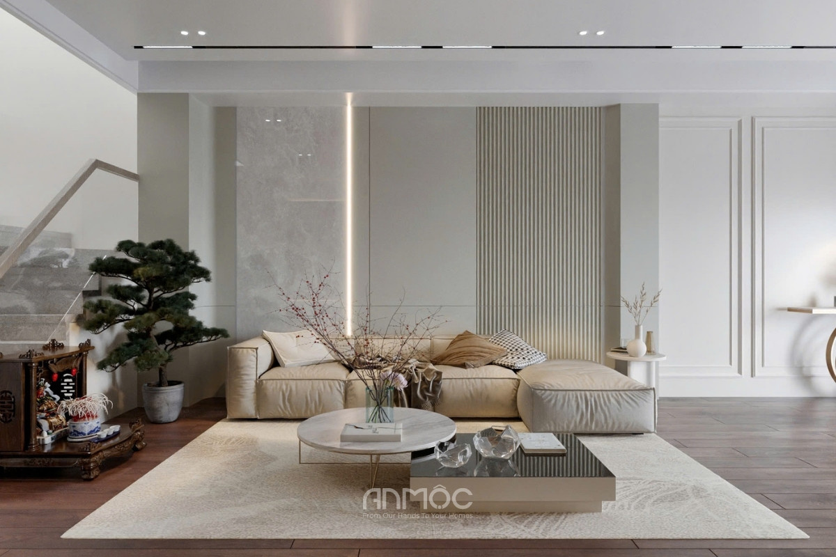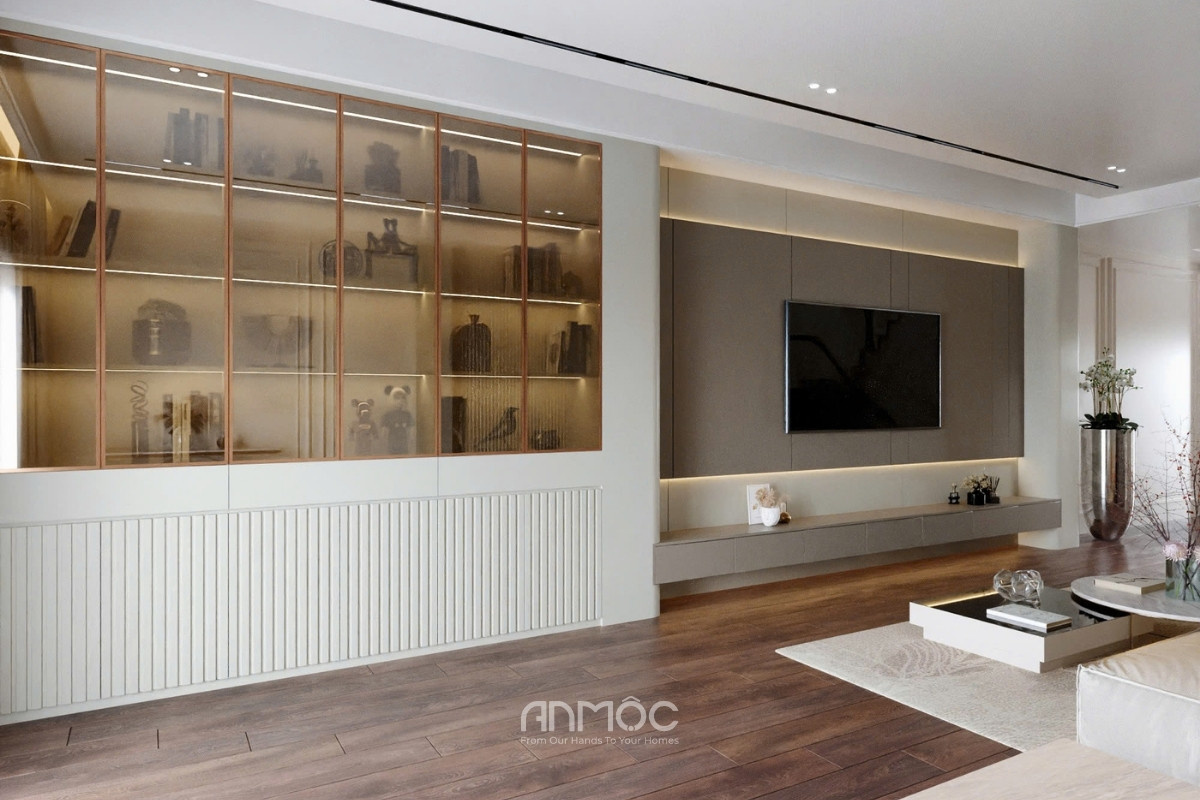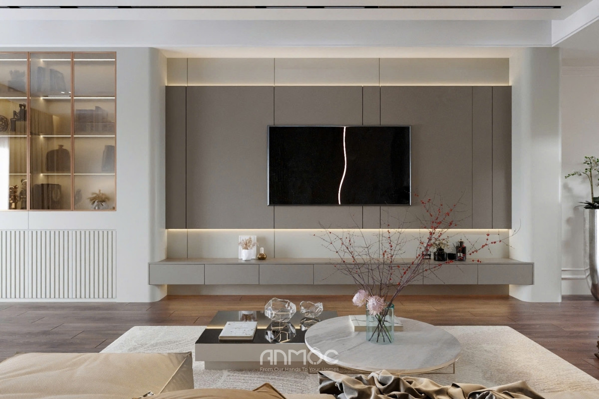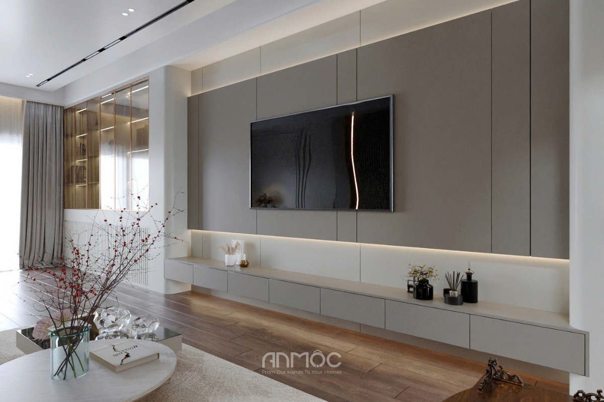 Phòng khách nội thất sử dụng tông be – nâu ấm chủ đạo với đường nét gọn gàng, mang đến cảm giác tinh tế và thư giãn, nổi bật là hệ vách tivi phẳng chia mảng cân đối kết hợp LED hắt sáng cùng kệ treo hiện đại, đi cùng sofa dáng thấp êm ái kết hợp bàn trà và thảm sáng màu.