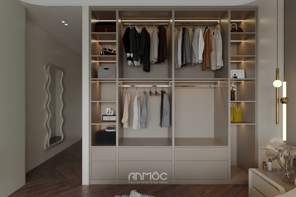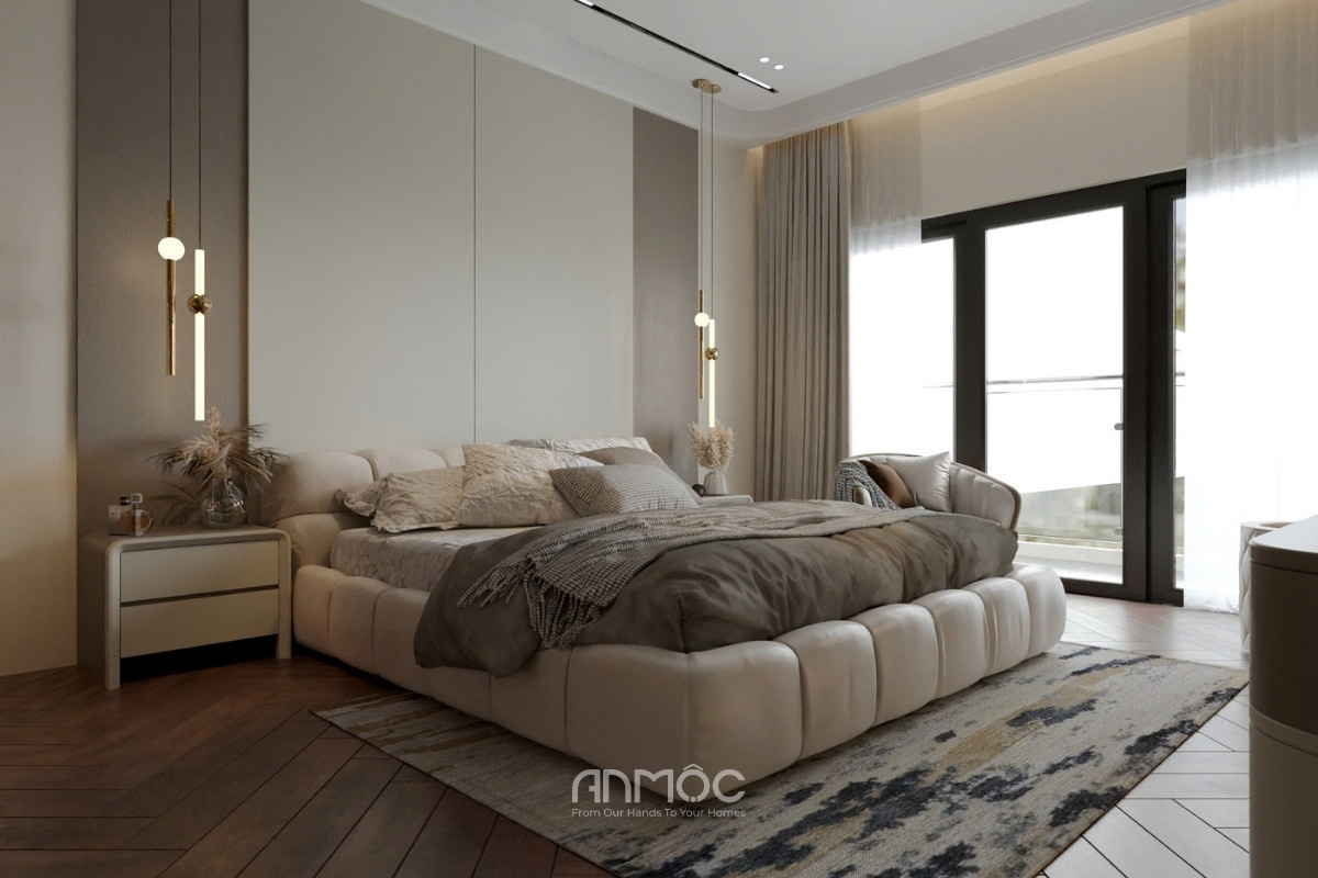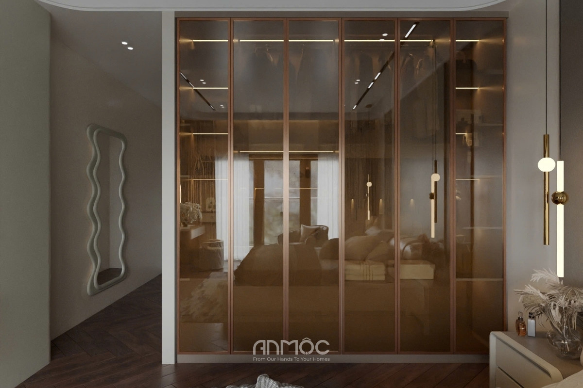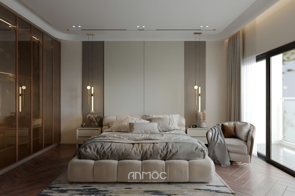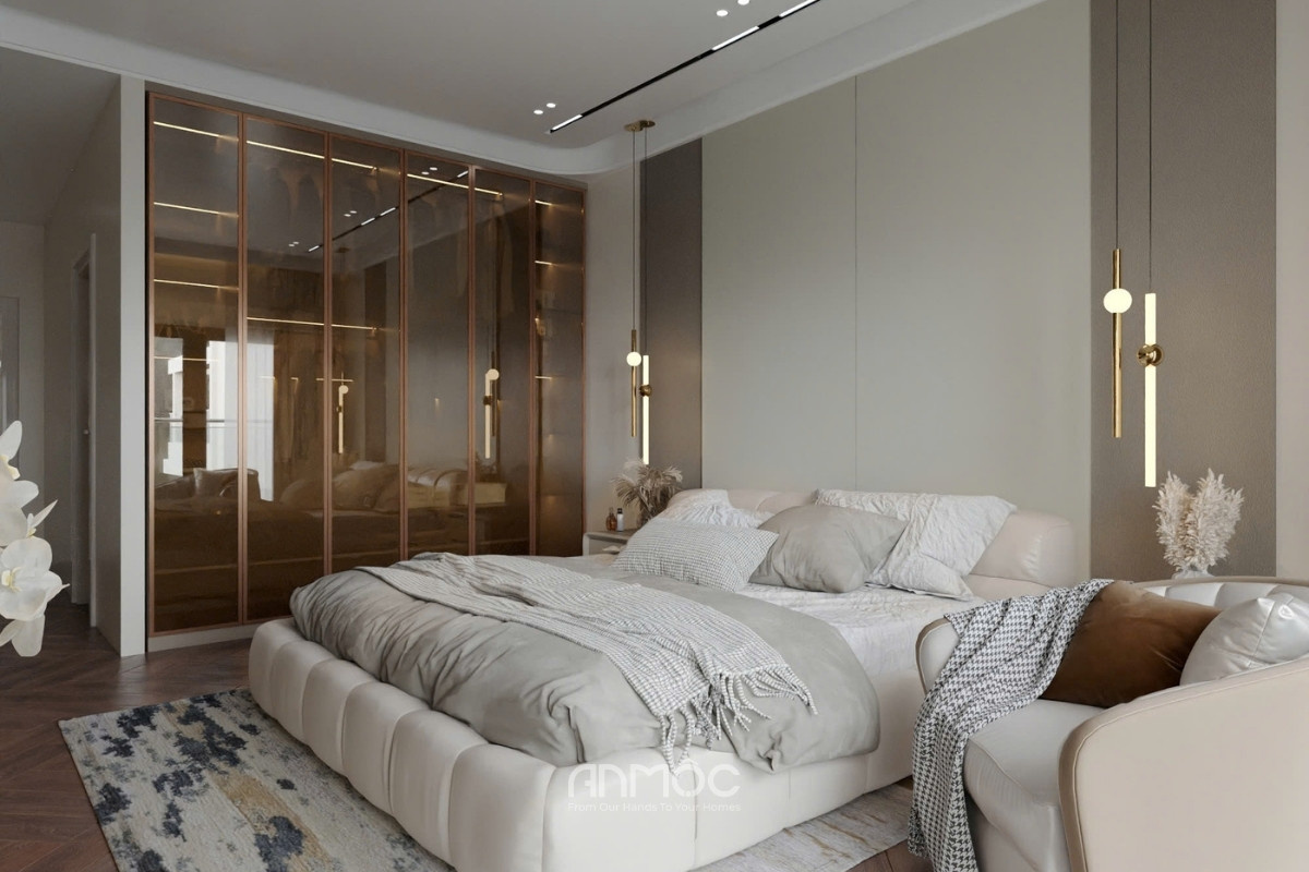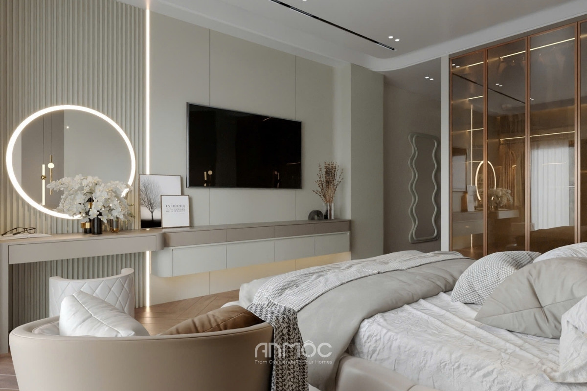 Không gian nghỉ ngơi nổi bật với hệ tủ quần áo cánh kính sang trọng và khu vực bàn trang điểm có gương LED làm điểm nhấn độc đáo. Giường ngủ bọc nệm êm ái kết hợp cùng ánh sáng đèn thả dịu nhẹ, tạo nên nơi nghỉ ngơi lý tưởng và thư giãn cho gia chủ.