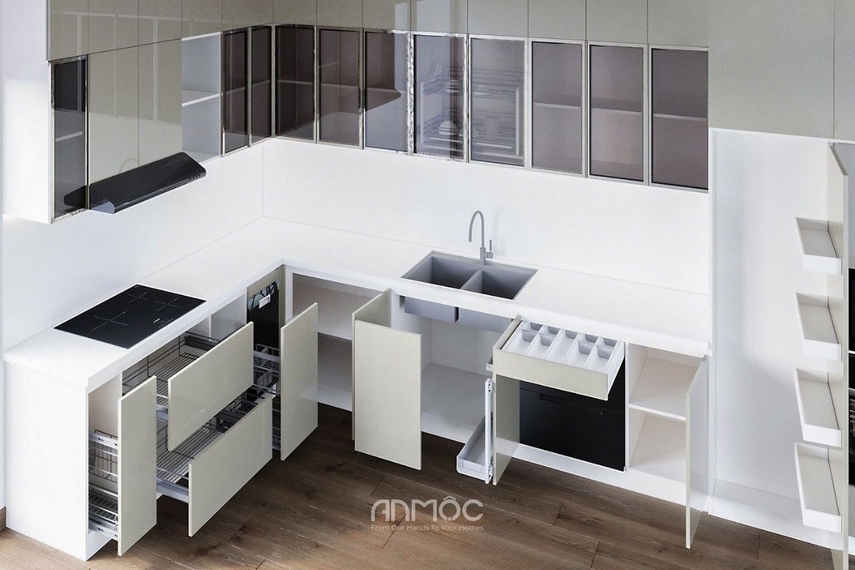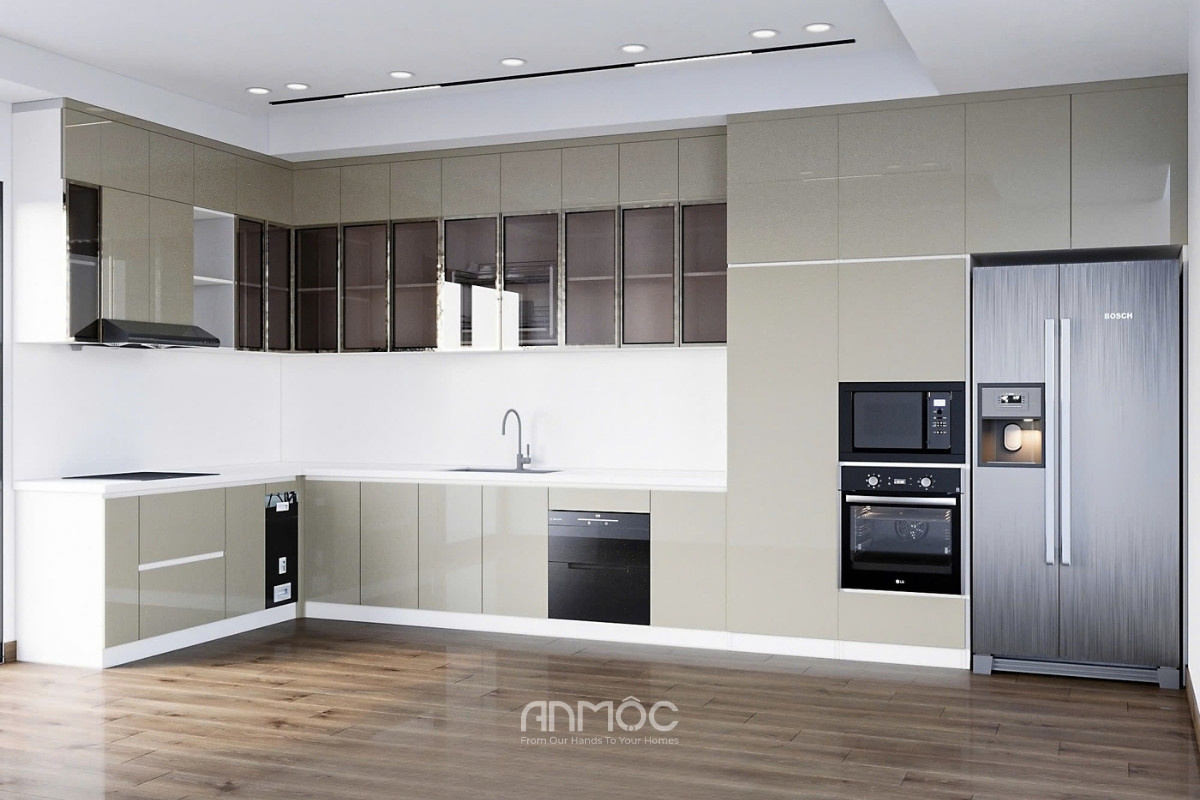 Nối tiếp không gian phòng khách là phòng bếp với hệ tủ chữ L kịch trần, kết hợp khéo léo giữa các ngăn tủ kín và cánh kính khung nhôm sang trọng. Khu vực nấu nướng được tối ưu diện tích bằng cách lắp đặt âm tủ các thiết bị cao cấp như tủ lạnh, lò nướng và máy rửa bát.