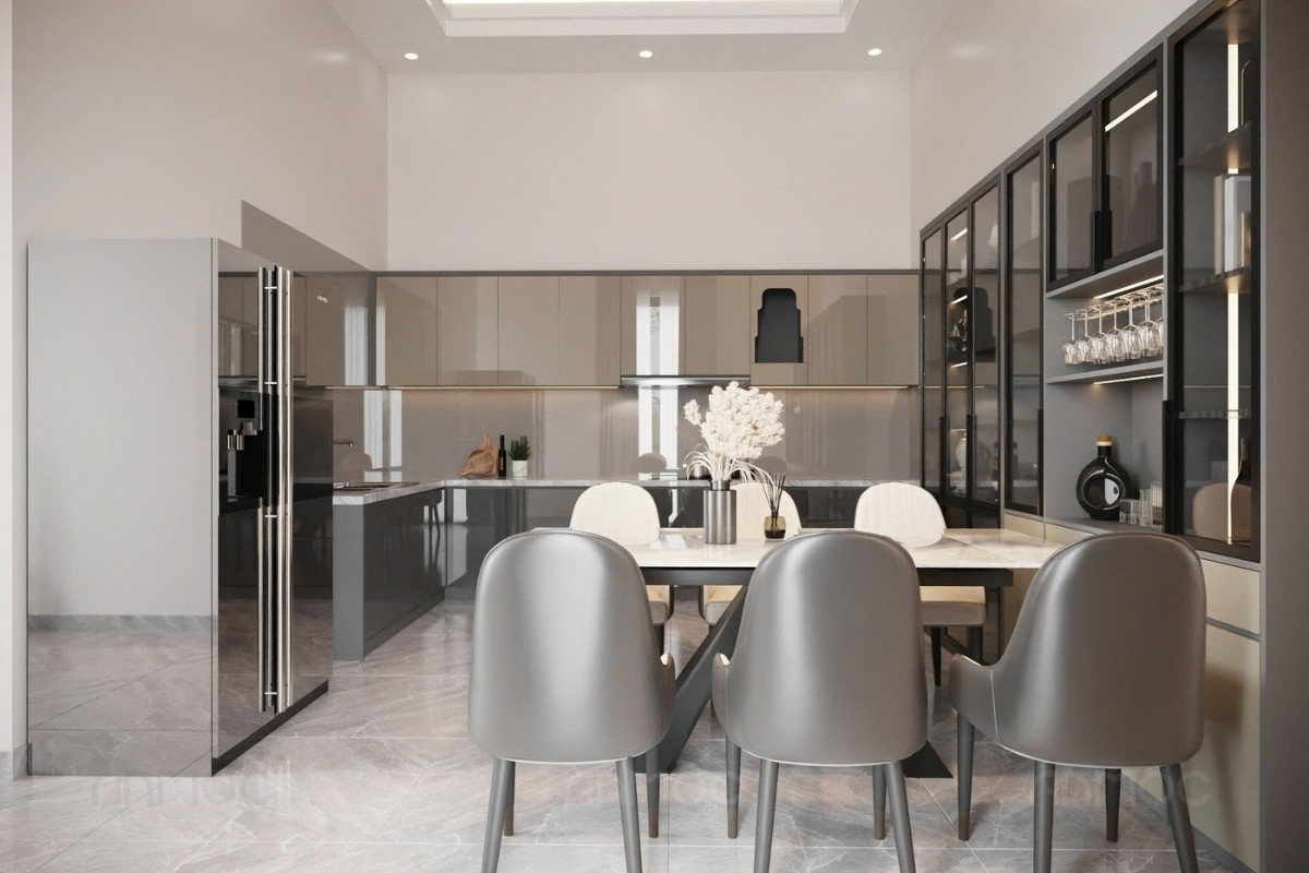 Một gian bếp đẳng cấp truyền cảm hứng đến người đứng bếp. Hệ bếp được bố trí với mô hình chữ L đơn giản mà sang trọng. Tủ bếp trên được thiết kế cao kịch trần giúp lưu trữ tối đa. Chất liệu gỗ công nghiệp phủ Arylic bóng kết hợp với cửa kính tôn lên vẻ cao cấp, chất lượng cho căn bếp. Màu bạc của hệ tủ bếp kết hợp với sàn bếp rất hợp tông, giúp cả căn nhờ như được liền mạnh thành một khối thống nhất.