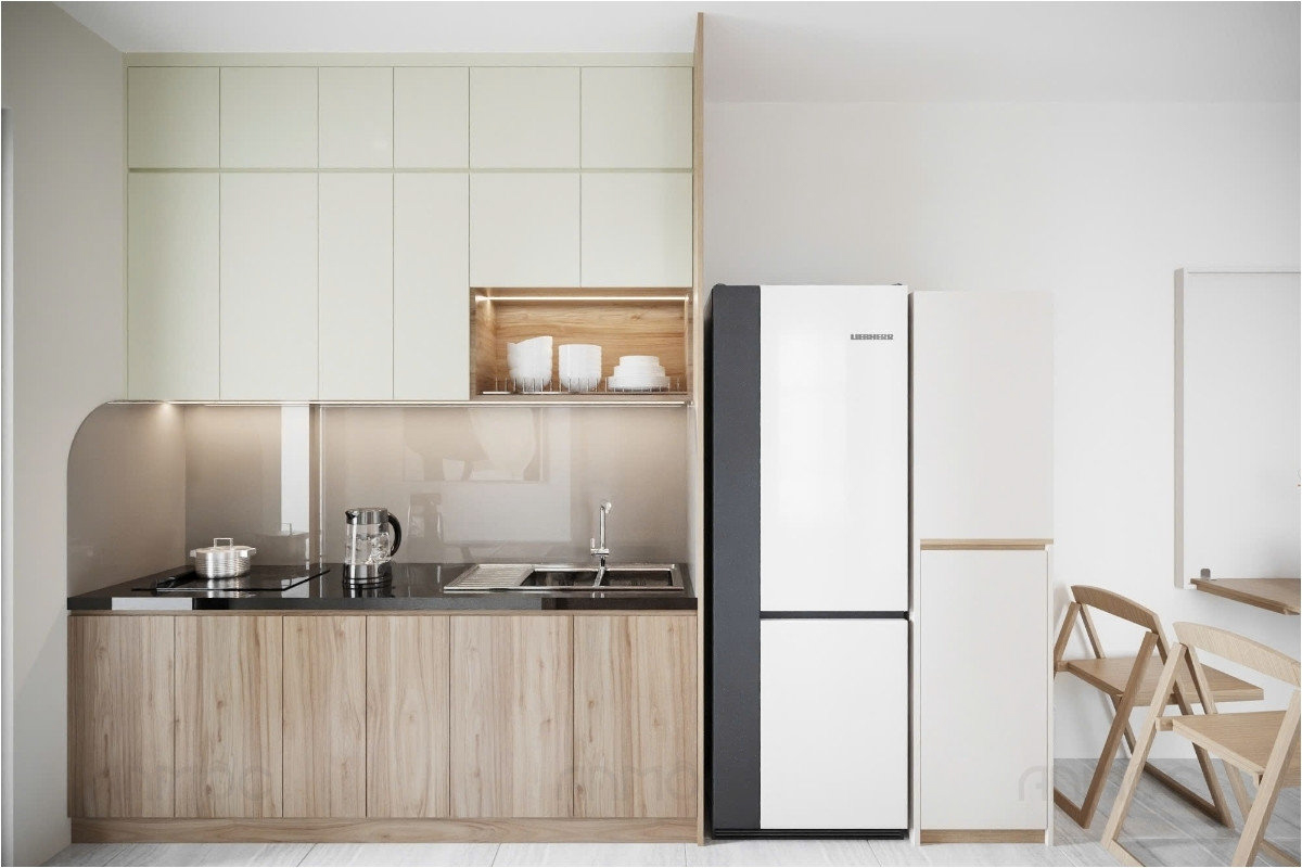 Mẫu 3: Nội thất phòng bếp đẹp với hệ tủ bếp chữ L nhỏ gọn cho căn hộ Studio