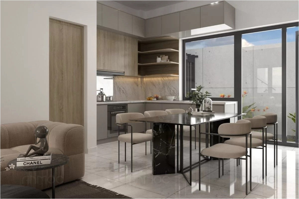 Với phong cách hiện đại, không gian bếp – phòng ăn được bố trí khoa học. Nội thất sử dụng có thiết kế sắc sảo, tập trung vào công năng. Các gam màu trung tính, tươi sáng được sử dụng tối đa nhằm mang lại một căn bếp vừa sang trọng, thoải mái.