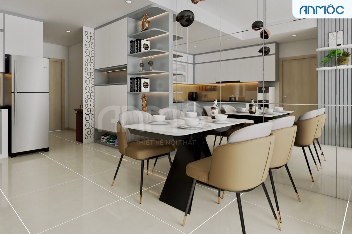 Vách bàn ăn trang trí tấm gương lớn tạo cảm giác rộng thoáng, mang lại sự lung linh và mới lạ cho nội thất phòng bếp.