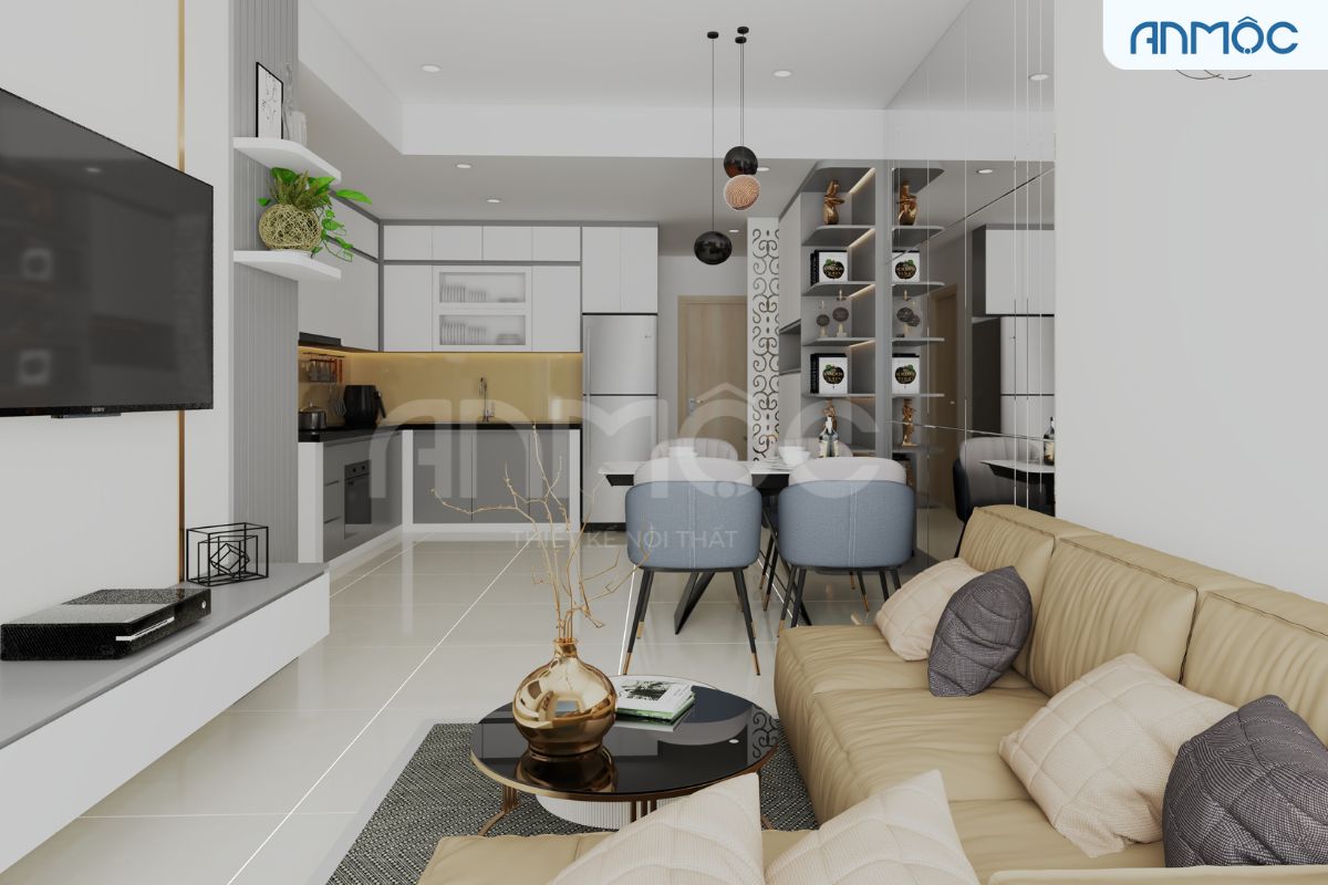 Điểm dừng chân tiếp theo của An Mộc chính là căn hộ, tọa lạc tại quận 7. Chị Liên – một chị chủ nhà vui vẻ, thân thiện và gần gũi. Qua chia sẽ được biết chị muốn tân trang lại” bộ mặt” của ngôi nhà, cụ thể là phòng khách và phòng bếp. Chị yêu thích phong cách hiện đại, sang trọng nên KTS đã kiến tạo nên một không gian như ý chị. Chúng ta cùng xem không gian này có điểm gì nổi bật nhé!!