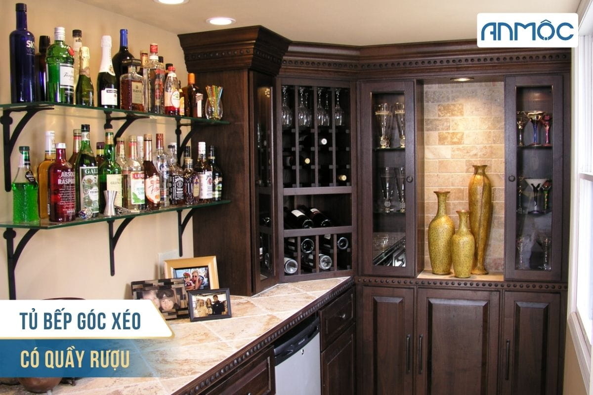 Quầy rượu được thiết kế ở phần trên hoặc dưới của tủ bếp góc xéo, thường sẽ có các ngăn trưng bày rượu, ngăn đựng ly, chén và một số ngăn đựng các vật dụng trang trí nhỏ, sử dụng chất liệu kính trong suốt để làm nổi bật chiếc quầy hơn. Thiết kế này tạo nên sự độc đáo, hiện đại và thẩm mỹ cho không gian bếp.