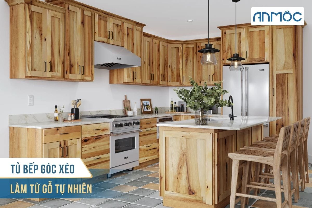 Tủ bếp góc xéo làm từ gỗ tự nhiên