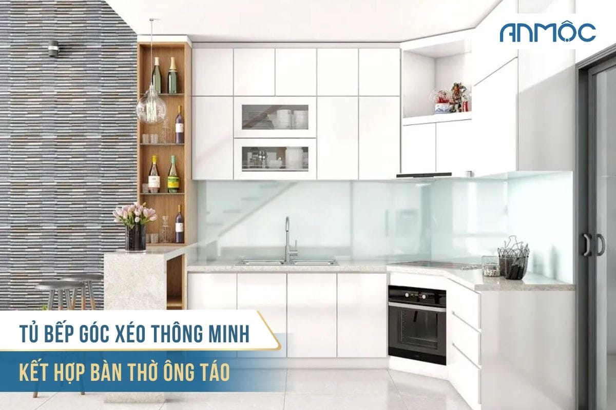 Đây là một món nội thất có thiết kế sáng tạo và tiện lợi, mang tới sự gọn gàng và đầy đủ chức năng cho căn bếp. Tương tự các mẫu tủ bếp góc xéo khác, mẫu tủ này cũng được thiết kế đầy đủ các ngăn tủ kéo, kệ mở,… để đựng đồ gia vị, đồ nấu bếp. Bên cạnh đó, nó được bố trí thêm bàn thờ ông Táo thường đặt ở phần trên cùng của tủ hoặc trong một ngăn tủ riêng biệt để đảm bảo sự trang trọng và tôn kính.