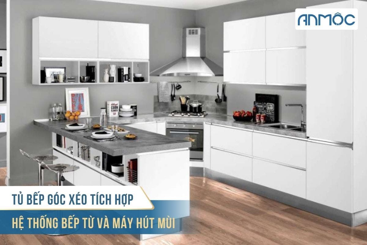 Tủ bếp góc xéo tích hợp hệ thống bếp từ và máy hút mùi