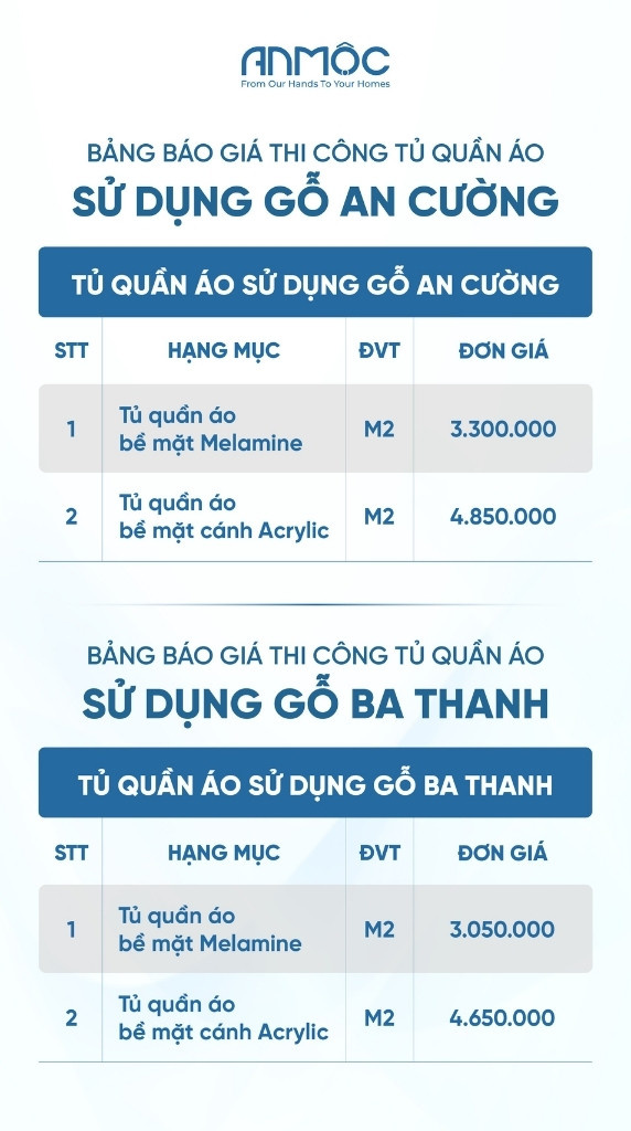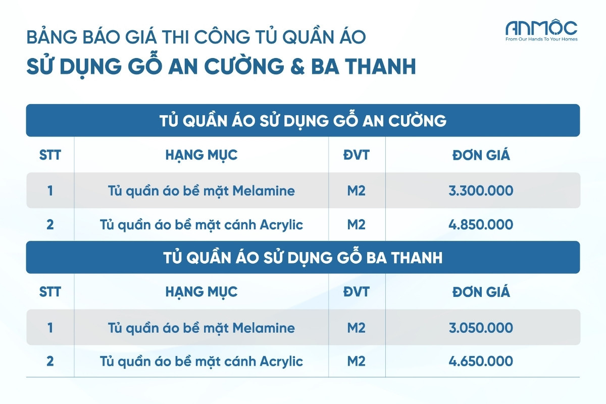 Báo giá thi công tủ quần áo gỗ An Cường và gỗ Ba Thanh